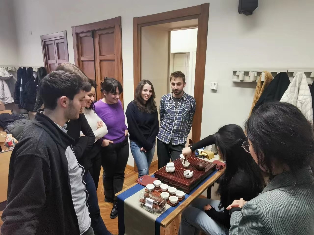 紧接着,徐啟若老师向大家展示了茶艺,并简要介绍了六大茶类以及茶道基本礼仪。随后,学生代欣悦(Letizia Dalla Rossi)和西蒙(Simone)分别体验了茶艺,并邀请同学们一起品茗。