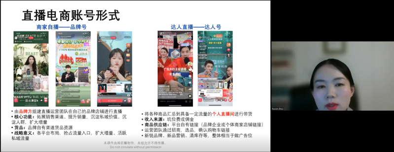 周若馨老师首先介绍了中国的电子商务网民规模,以及电子商务的移动化、社交化、智能化特点,同时还回顾了直播电商的发展历程、传统电商平台与社交电商平台的区别、如何做直播电商、中国跨境电商的情况、全球跨境商品流通、全程履约服务等。她说,直播电商是一种新型的电商形态,作为提供深度实时视听结合的商品展示,为用户带来更加丰富、直接、实时的购物体验,拥有强互动性与高转换率等优势。