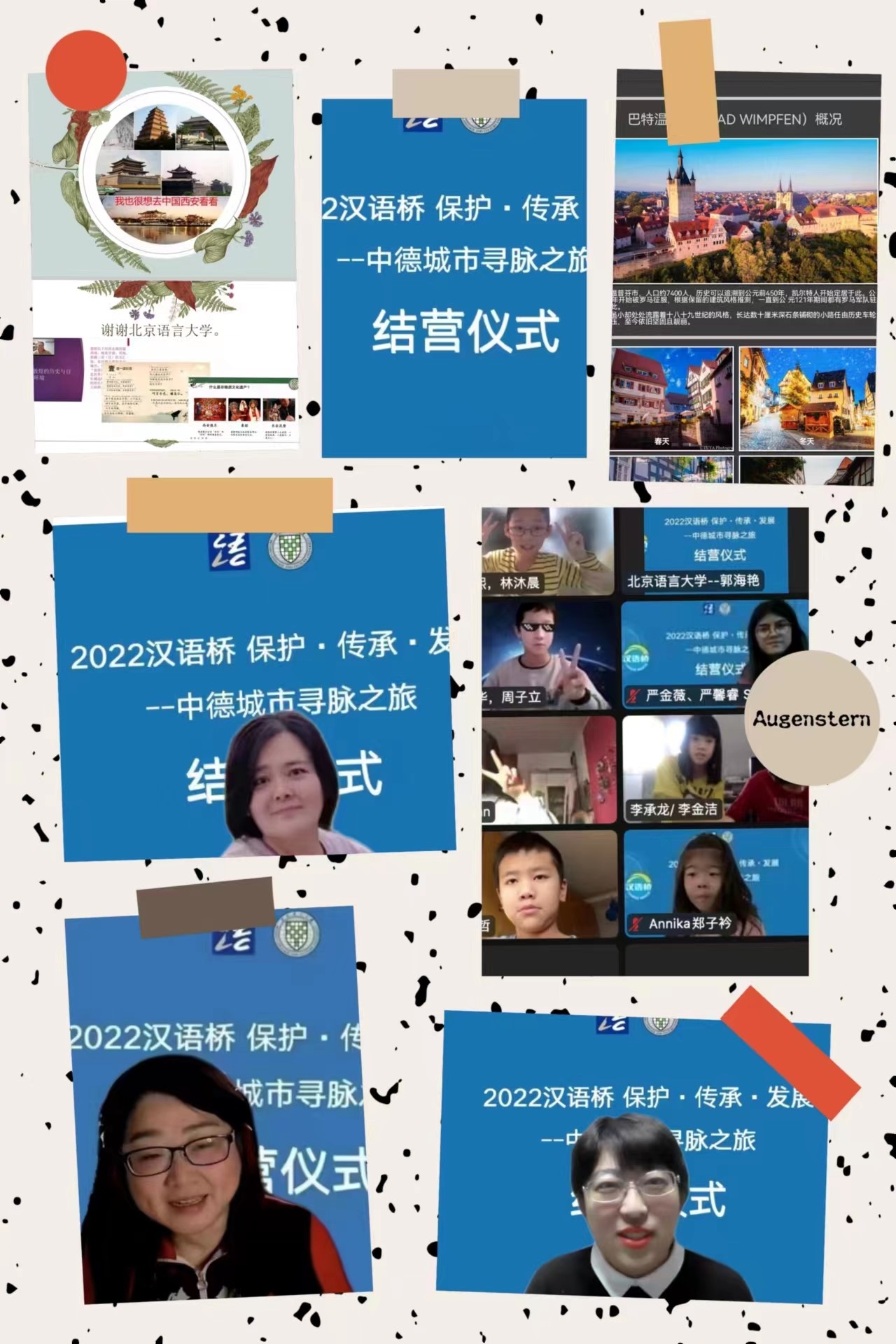 2月17日,伴随着冬日里和煦的阳光,我们满怀欣喜,满载收获,迎来了汉语桥“保护·传承·发展——中德城市寻脉之旅”主题交流营的最后一次直播课暨学员成果展示和结营仪式。北京语言大学的老师们和来自德国内卡河畔参加此次主题交流营的130名同学共聚云端,其乐融融地分享着此次交流营留下的喜悦和感动。本次结营仪式由北京语言大学国际中文教育实践与研究基地郭海艳老师主持。