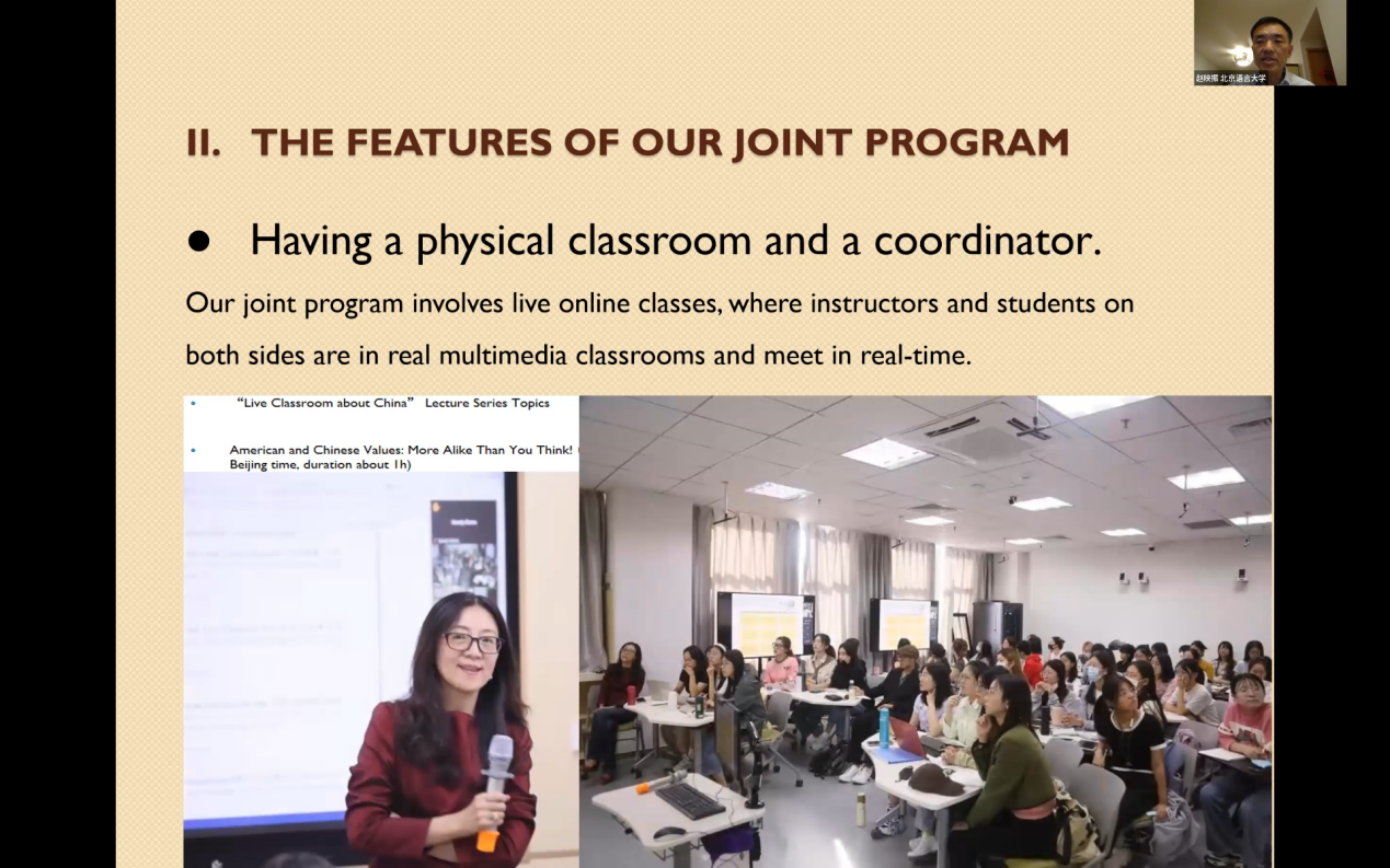 项目进行了“两个城市,一个教室”的尝试,利用实体多媒体教室开展远程教学,并在教室中安排指导教师,及时处理学生学习和技术支持出现的问题,为了给美国学生提供背景知识,项目还录制了配套的录播课程,在充分利用线上教学的低成本和便利性的同时,尽可能保证了教学活动顺利进行。