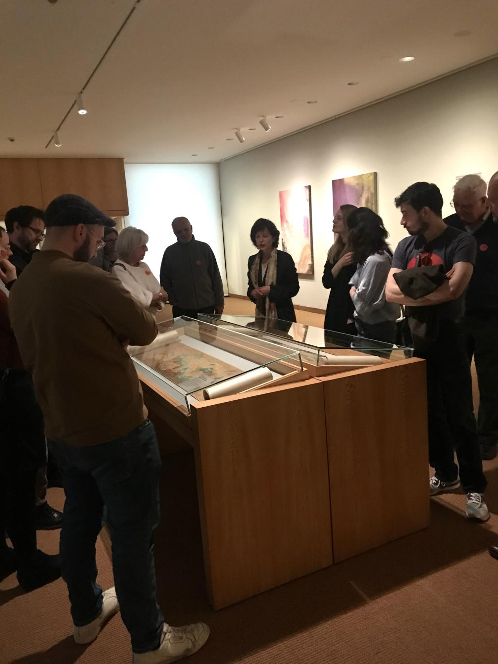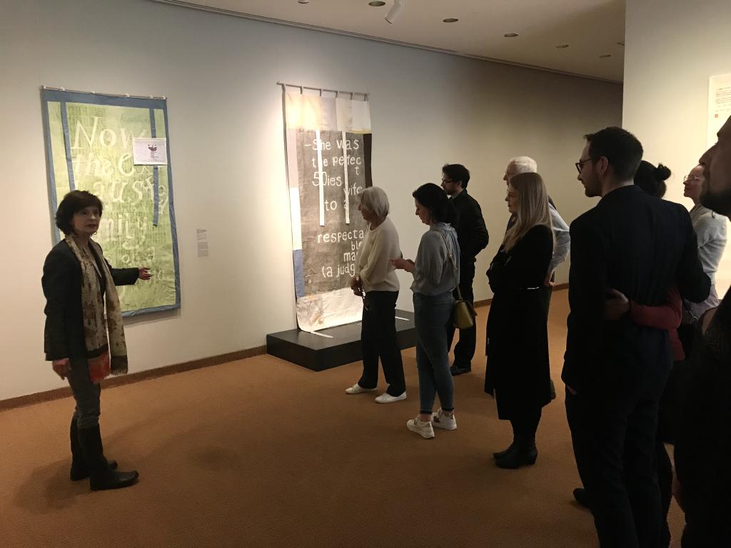 参观过程中,阿戴勒•施隆姆斯博士详细地为大家介绍了每一件展品的创作背景和创作技巧,作品特点以及作品体现出的东西方文化在艺术方面的相互渗透和相互影响。比如来自画家王伊芙苓韬程的作品,她用脱胎于中国水墨画的写意笔触结合旅居海外间的经历与思绪,使大家感受她诗意语言下的幽默与直率。在创作过程中,她对中国传统艺术技巧(白描、工笔画、拓印、手卷等)和西方文化(书写字母、传统节日等)进行了巧妙的结合,创作出为多种主题服务的作品,例如中国传统与现当代艺术,以及殖民历史、酷儿、女性文化与女性主义运动等,并通过重叠混合,将这些相互独立的概念交融链接。这场展览使参观者踏入东方传统艺术的世界,并感受其与西方文化的往来与交流。