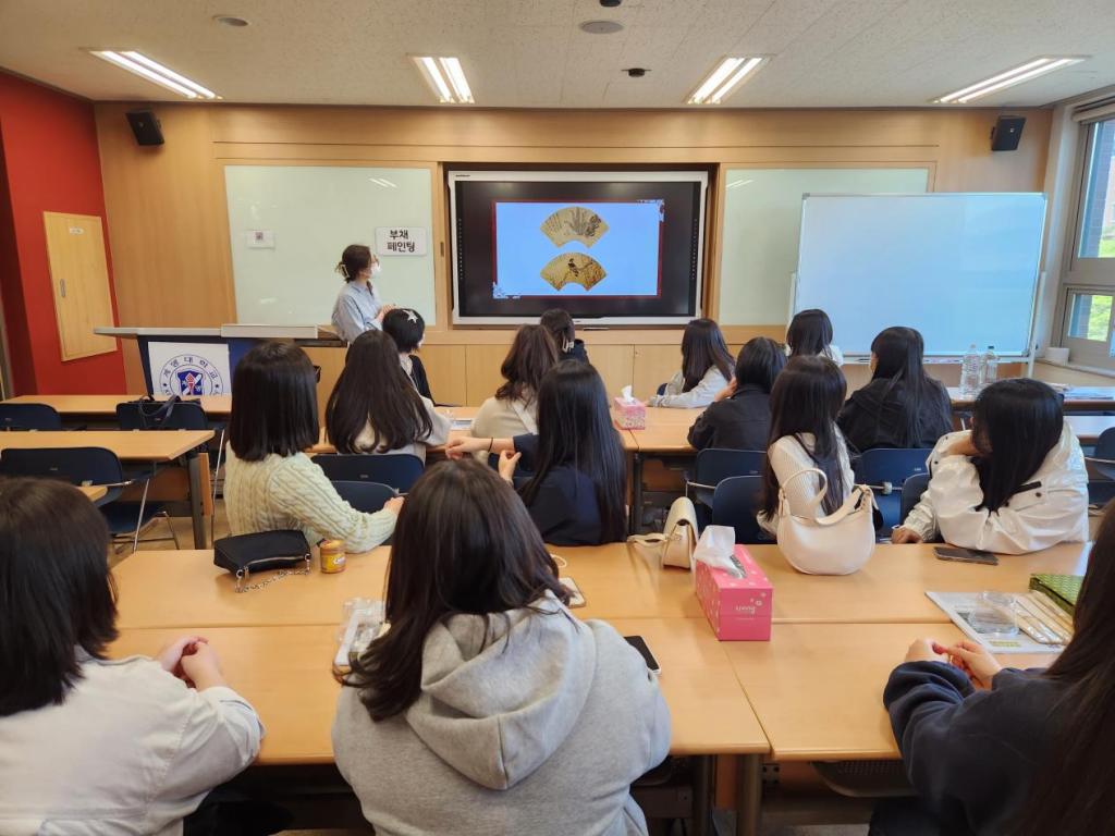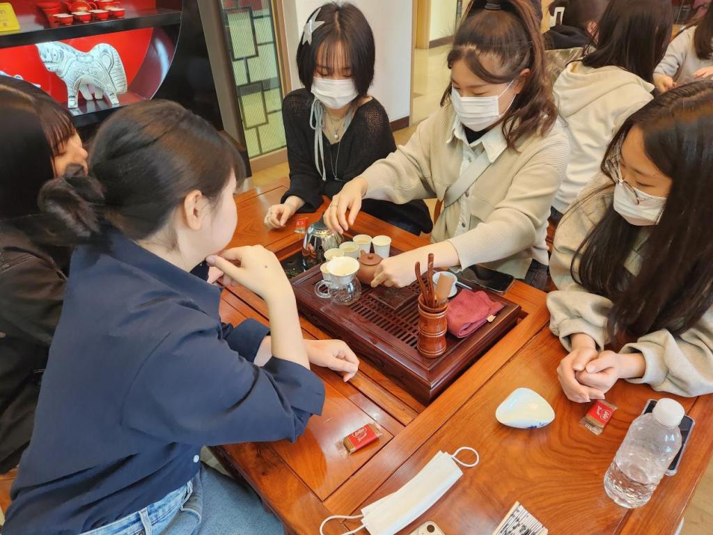 4月5日,启明大学孔子学院迎来了一群特殊的访客——来自庆尚北道若木高中(약목고등학교)的40余名学生,在孔子学院举办的中华文化活动中,亲身体验了绘制传统扇面和中华茶艺制作过程。
