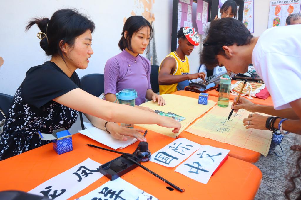 在中华文化展示与体验环节,马辉大使逐一参观了各个文化展示摊位,与参与者亲切交谈。现场人头攒动,观者如堵,孔院教师纷纷使出拿手绝活,吸引了大量文化爱好者。孔院特聘中医教师卡洛斯热情讲解中医文化,提供按摩、针灸、拔罐、刮痧等体验活动,观众排起队,期待感受中医的神奇与奥妙。中国结编织活动吸引了大量学生参与,孔院教师身着汉服,为学生展示不同样式的中国结,耐心指导学生编织。书法摊位也是人来人往,学生很享受用毛笔写下自己中文名字的成就感。剪纸和折纸摊位,在教师指导下,学生们让简单的纸张变换出不同的花样,用剪刀剪下窗花及各种字样,用折纸折出承载美好祝愿的千纸鹤。中国画摊位展示的锦鲤、熊猫等图案,也吸引学生纷纷拿起画笔进行创作。