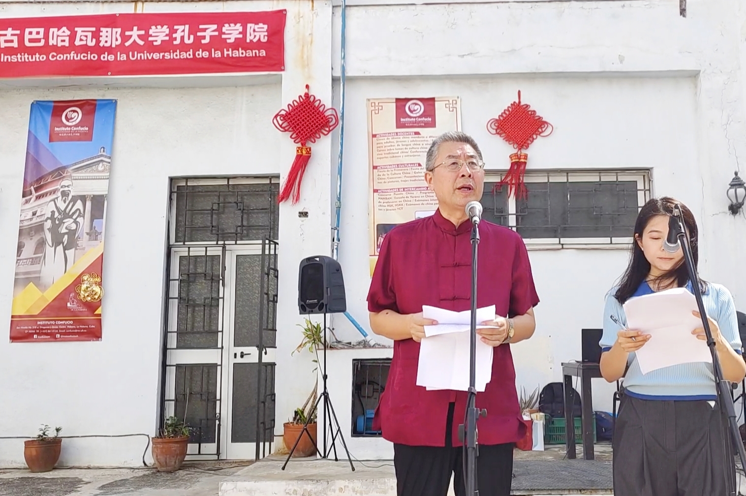马辉大使在讲话中介绍了国际中文日的涵义,中文日这一天是中国二十四节气的第六个节气——谷雨,“雨生百谷”寓意万物生长、蒸蒸日上;相传仓颉“始作书契,以代结绳”,在谷雨这天创造了文字,所以中文日也是为了纪念中华文字始祖仓颉造字的贡献。中文在当今世界发挥的作用越来越重要,马辉大使介绍了古巴中文教育从筚路蓝缕到逐渐兴盛的发展历程,表示哈瓦那大学孔子学院的成立开启了古巴中文教育的新篇章,为古巴民众提供了专业、便捷、可持续的中文学习平台。如今,古巴民众学习热情持续高涨,中文教育陆续走入中学和大学,新教学点不断开设。迄今,已有万余名古巴学生走进中文课堂,成为中古友谊的推动者、促进者、贡献者。最后马辉大使倡议以语言为舟,跨越隔阂,中古双方携手,不断推进人文交流、文化交融、民心相通,共筑生机盎然、开放包容的美好未来。