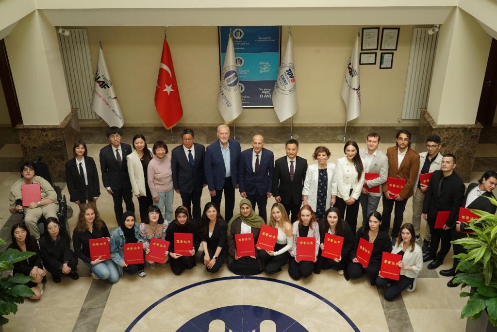 5月22日,中国驻伊斯坦布尔总领事馆吴健代总领事、孟凡伟领事、邓慧萍副领事及贾逸凡先生一行四人访问了奥坎大学,并为荣获“2022年度中国总领事奖学金”的29名奥坎孔院学员代表颁发荣誉证书。