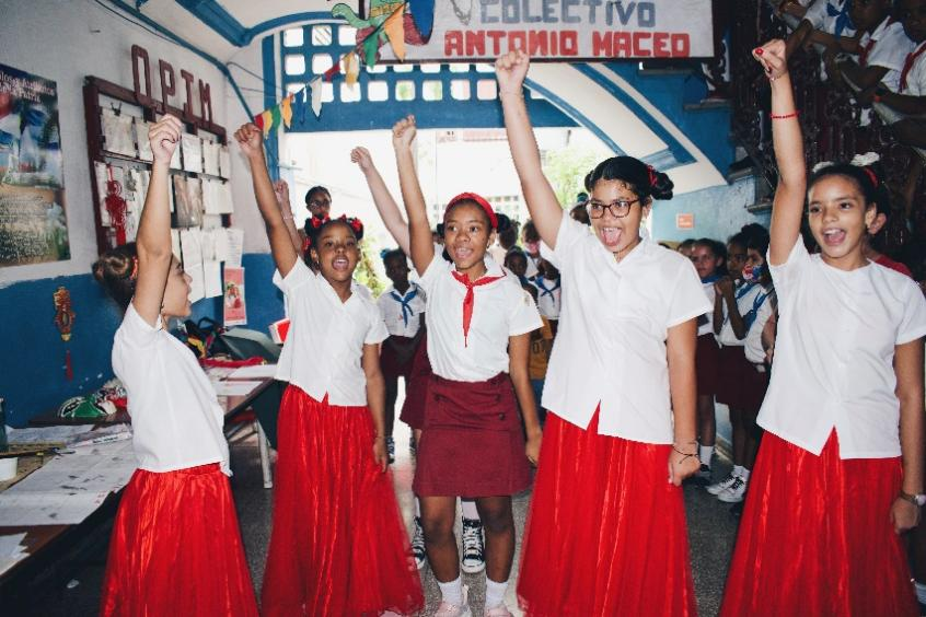 庆祝活动在别具一格的表演节目中拉开序幕。孩子们精心准备了古巴现代诗朗诵、合唱表演以及舞蹈表演等。其中,合唱表演主要歌颂了卡斯特罗与何塞马蒂等古巴英雄人物;舞蹈表演的曲目是中文歌曲《胭脂妆》,由孔院教师马慧琳辅导的五年级学生出演。
