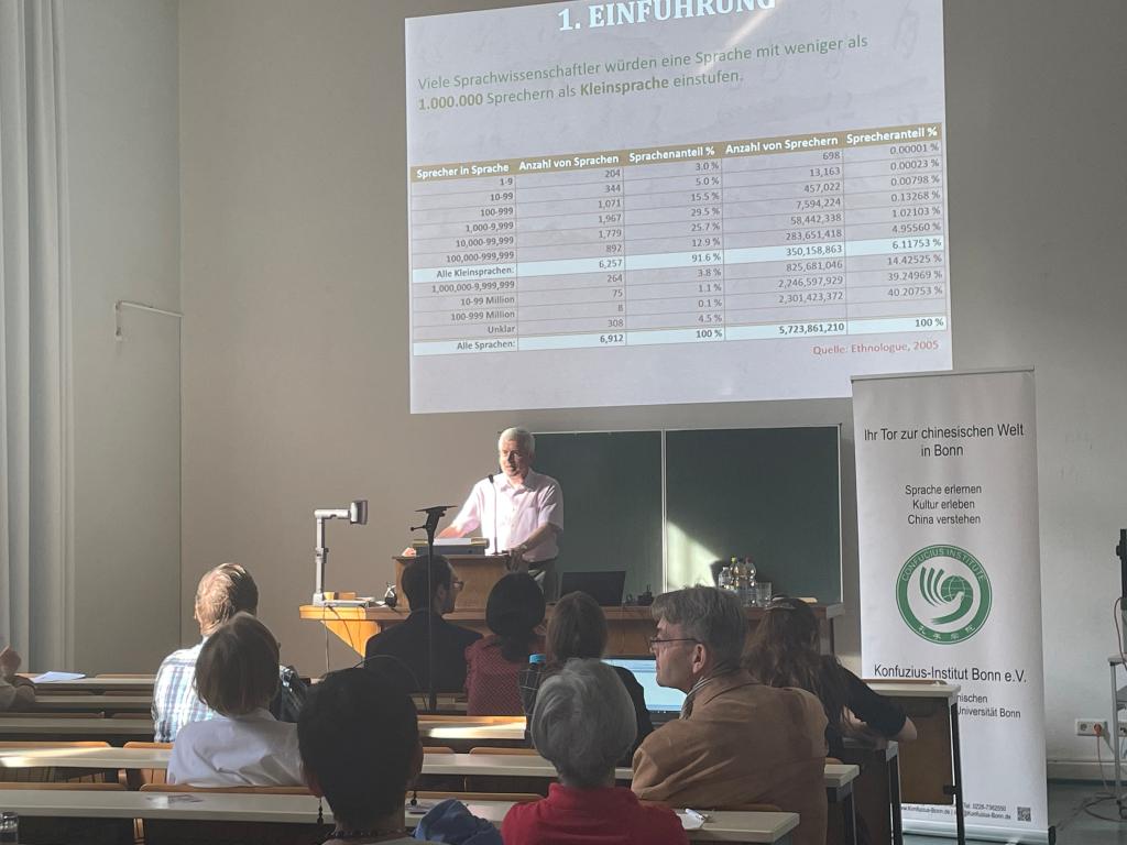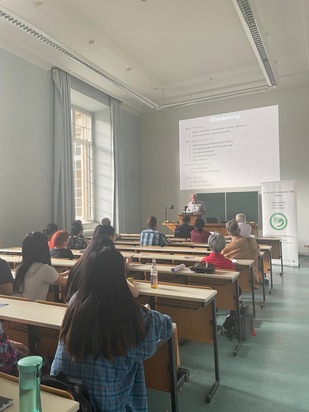 6月26日18点,波恩孔子学院携手波恩大学汉学系在大学主楼阶梯教室成功举办了“中国的濒危语言”主题讲座。主讲人为来自上海交通大学的马嘉思教授(Prof. Dr. Matthias Gerner),波恩孔子学院理事会理事长廉亚明教授(Prof. Dr. Ralph Kauz)担任本次讲座的主持人。