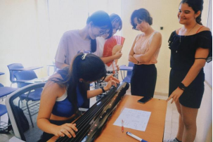 涂巧为老师讲授的古琴课,通过介绍古琴文化、古琴名曲赏析、学习阅读古琴特有的“减字谱”,让学生对古琴形成较全面的认识。在教师指导下,学生逐一体验如何演奏古琴,亲身感受指尖弹拨琴弦时的触动,聆听琴弦奏响古音时的感动,让学生真切感受到传承千年的动人之音。