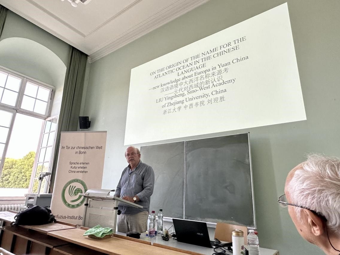 当地时间7月10日星期一18点15分,由波恩大学孔子学院和波恩大学汉学系共同举办的 “汉语语境中大西洋名称来源考-元代对西域的新认识”讲座在波恩大学主楼举行。此次讲座,孔子学院有幸邀请到了浙江大学中西书院刘迎胜教授为听众讲解他针对“大西洋”名称的溯源。来自波恩大学汉学系的廉亚明教授(Prof. Dr. Ralph Kauz)担任此次主持。
