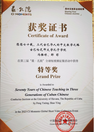 哈瓦那大学孔子学院制作的《悠悠七十载,三代古巴华人的中文教学之路》喜获最高殊荣——特等奖。该视频由哈大孔院两名志愿者教师冯雅婷、邵影合力拍摄制作完成,冯雅婷同时荣获了全球“孔院达人”称号。用镜头雕刻孔院时光,传递语言联通、文化交融的温暖力量。2022年11月开始筹备拍摄,直至2023年6月制作完成,哈瓦那大学孔院给予了新媒体小组全方位的支持与帮助。丁汀院长策划选题、全程组织、积极协商沟通,让摄制组得以走进这样一个感人至深的中文教育之家。