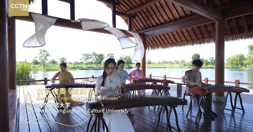 节目在实证中华五千年文明史的圣地——良渚国家考古遗址公园拉开序幕。这里是世界了解中国五千年文明的窗口,也为杭州亚运会提供了诸多“灵感”——杭州亚运会火种在良渚古城遗址采集;玉璧和玉琮是良渚文明的代表性玉礼器,杭州亚运会的火炬的出火口设计就来自“琮”最早的甲骨文字形;杭州亚运会吉祥物之一“琮琮”是以机器人的造型代表良渚古城遗址。在这里,北京语言大学艺术学院国际学生五色弦筝乐团以一曲《茉莉花》为节目开场。北京语言大学教师、古筝演奏家孙润与来自越南、缅甸、老挝、泰国的同学们身着民族服装共同表演,经典的旋律从五色弦中缓缓流出,学习中国传统乐器的国际学生,用旋律传达着他们对中国文化的理解。杨柳同学说,“泰国也有茉莉花,我们喜欢做茉莉花环,茉莉花的味道像母亲慈爱的感觉,因此茉莉花也是泰国母亲节的象征。”