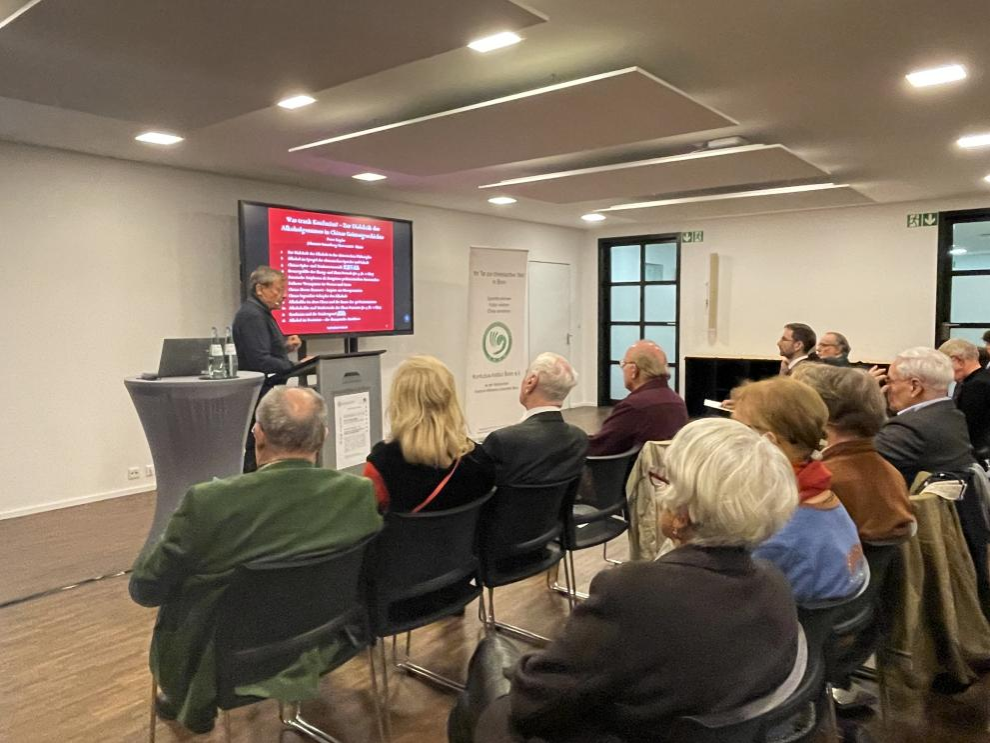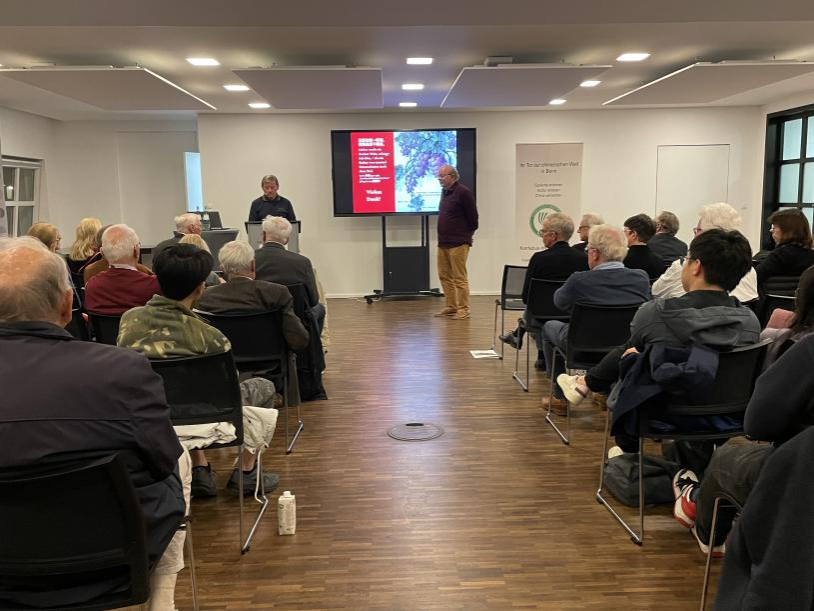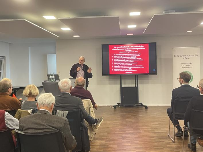 当地时间10月24日19点波恩大学孔子学院与波恩大学俱乐部共同举办了名为“孔子喝什么——中国饮酒文化中的辩证法”主题讲座。德国著名汉学家柯彼德(Prof. Dr. Peter Kupfer)为本次活动的主讲人。波恩大学俱乐部负责人根特·舒尔茨教授(Prof. Dr. Günther Schulz)和波恩大学汉学系的廉亚明教授(Prof. Dr. Ralph Kauz)担任本次活动的主持人。