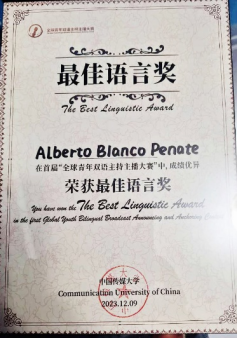 12月9日,首届“全球青年双语主持主播大赛”颁奖典礼在中国传媒大学中传讲堂隆重举行。来自哈瓦那大学孔子学院的学员白德辉(Alberto Blanco)从686名选手中脱颖而出,喜获最佳单元单项奖——“最佳语言奖”。古巴驻华大使白诗德先生亲自前往颁奖现场,领取了该奖项。