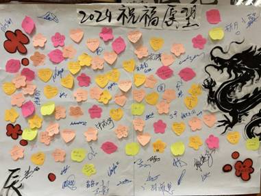 活动当天,贝基尔·奥坎礼堂被布置得格外别致,鲜艳的中国结、喜庆的红灯笼、中国特色的春联和祝福牌,处处洋溢着新春气氛。不仅如此,在礼堂的门口,设有签到席以及“2024祝福愿望”签名墙,身着中国特色服装的师生以及盛装出席的嘉宾们相互问候交流的同时,也写下了美好的祝福和愿望。