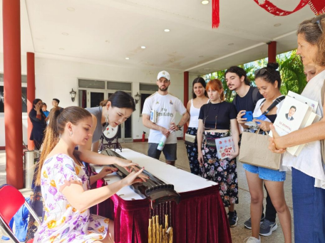 涂巧为和马慧琳老师弹奏了《桃李园序》《关山月》《酒狂》等经典古琴曲目,讲解、教授了古琴的基本指法。学员王以然在孔院学习过古琴曲《沧海一声笑》,现在对照曲谱依然可以弹奏出来,她热心辅助老师们向观众介绍古琴。古巴民众现场体验弹拨琴弦,指尖轻触,中国乐器的美妙便跃入心头。