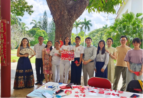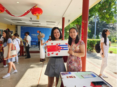 许艺和王懿明老师负责的剪纸展位主要展示了梅花、五角星、心形、立体“春”字的剪纸作品,还精心准备了剪纸的各个步骤的示意样例,方便现场教学。剪纸颇为要求手眼协调,一些图案略微复杂,但大家都非常有耐心有兴趣。观众踊跃参与,剪出一颗颗心形图案,签名后郑重贴在绘有中国和古巴国旗的展板上。虽然形状各异、大小不一,但都代表着拳拳的爱国心,对中古两国友谊的美好祝福。