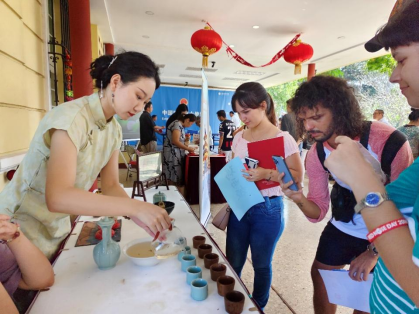现场设置了茶艺、书法、剪纸、古琴等文化体验活动,提供了中国图书和文创产品。孔院志愿者教师郭芮希进行茶艺表演,娴雅展现茶叶闻香、冲泡、品鉴、礼仪等各个方面,并以点茶的手法在茶盏中画出“Cuba”(古巴)字样,传递出中古文化交融、友谊绵长的美好愿望。大家对茶艺礼仪、茶具的使用、各类茶的冲泡时间和功效都表现出了浓郁的兴趣。古巴朋友品尝了西湖龙井、普洱茶,第一次喝到了不加糖的地道中国茶,都纷纷竖起大拇指。