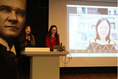 在宣讲会开始之前,奥坎大学Mevlana礼堂入口处热闹非凡。奥坎孔院的学生助理心慧(Ebrar Çalışkan)和梦乡(Sıla Dinçer)不仅热情地向学生们简单介绍宣讲会的内容,还分发了奥坎孔院及北语的小纪念品,欢迎大家的到来。线上Zoom会议室里同样热闹,很多无法到现场参加宣讲会的老师和同学都通过线上平台积极参加,其中不仅有大学生、高中生,还有许多通过奥坎孔院线上课程或者其他网络平台自学汉语的中文爱好者。有些学校,例如安纳托利亚伊玛目哈蒂普高中,还组织学生们在教室一起观看。