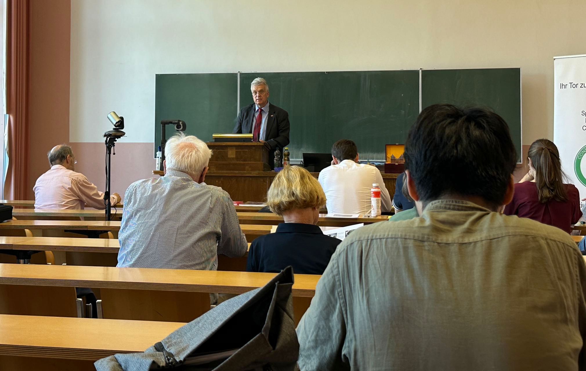 当地时间5月14日下午6时许,波恩孔子学院与波恩大学汉学系邀请东亚德国人生活研究协会(Studienwerk Deutsches Leben in Ostasien e.V.)会长舍康海博士(Dr. Karl-Heinz Schell)于波恩大学举办了“保存当代见证,促进历史联系发展--东亚德国人生活研究协会的建立与活动”讲座。本次讲座还邀请了协会成员赫尔穆特-克里斯蒂安-弗拉明先生(Herr Helmut Christian Framhein)作为历史见证者参与本次讲座,并为大家讲解其二十世纪四十年代在中国天津的生活经历。