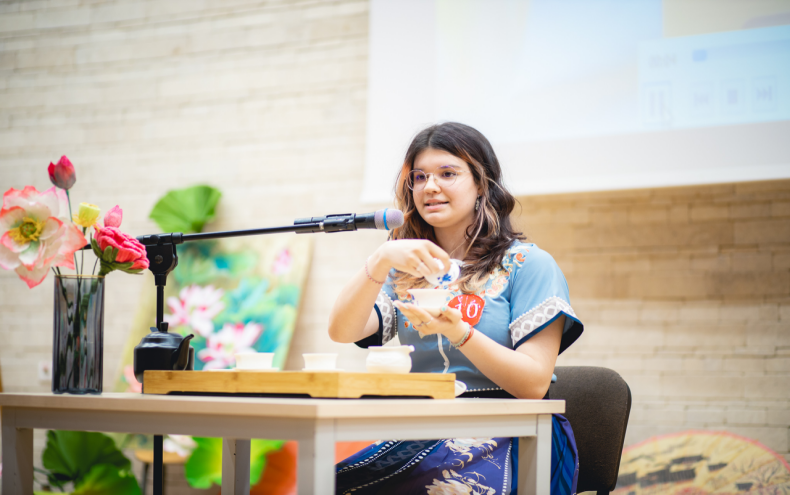 德艺燃(Talinga Ioana Gabriela),18岁,学习汉语一年半。她标准流利地讲述了自己逐梦中文的经历,又在展示茶艺的同时向大家介绍了不同茶具的用途以及饮茶的好处,落落大方的表现引得现场掌声连连。最终她以扎实的汉语基础和精彩的表演获得了一等奖的好成绩,也获得了前往中国观摩“汉语桥”世界中学生中文比赛总决赛的资格。
