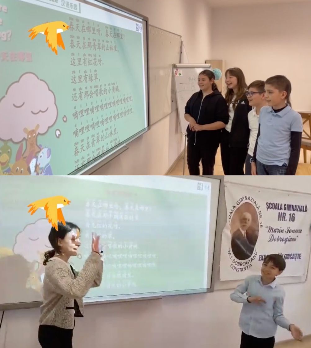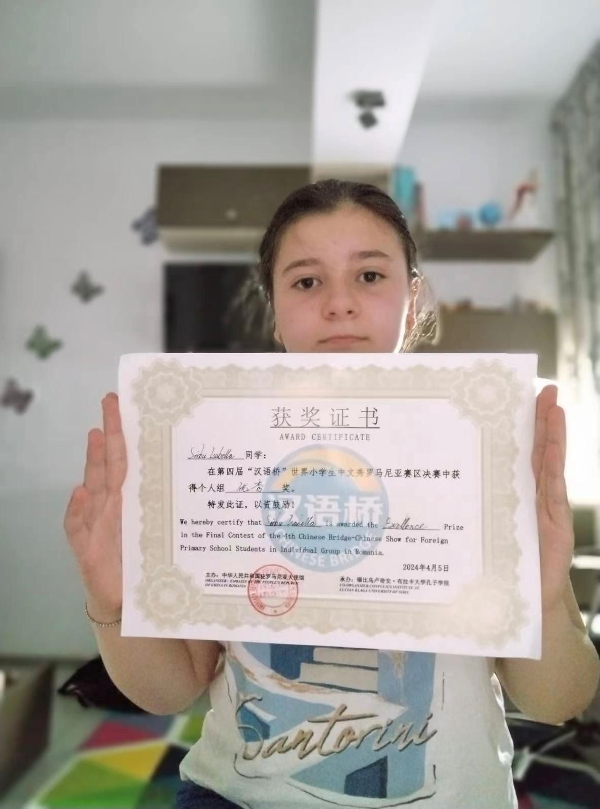 在本次“汉语桥”世界中文比赛小学生比赛中,康港课堂选手伊莎贝拉(Sirbu Isabella)声情并茂地朗诵了古诗《惠崇春江晚景》,荣获个人优秀奖;Comșa Ștefan、Cojocariu Ana-Maria、Abdulgani Anelis、Mihalache Briana Dragomir Fabian、Cărbune Luka 等6位选手通过一首中文歌曲合唱《春天在哪里》展示了他们的中文学习成果,获得了团体三等奖。