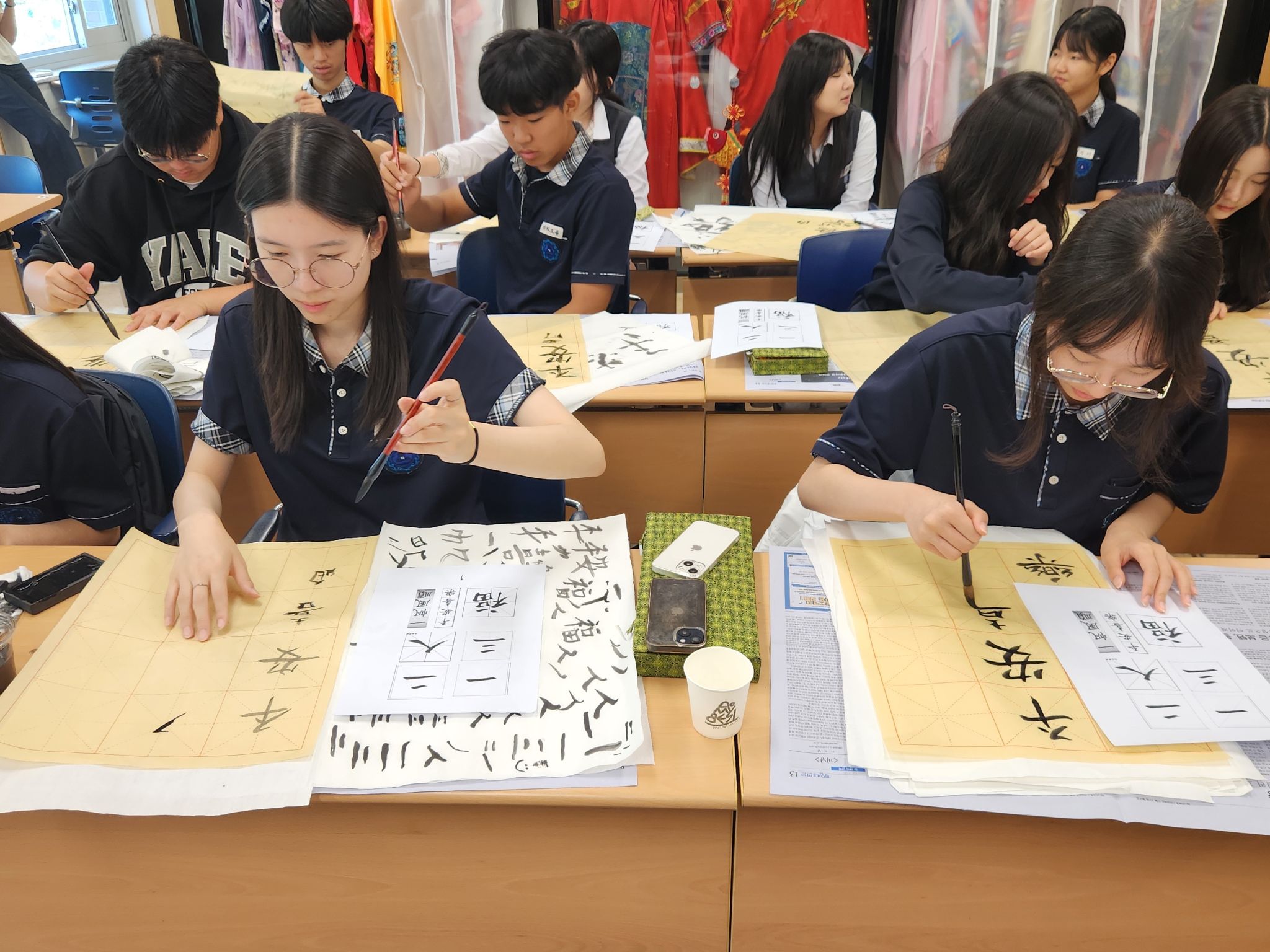 李淑一老师以生动的方式讲述了汉字的起源。从上古的结绳记事,到仓颉观察鸟兽足迹创造汉字的传说,学生们惊叹于中国先民的智慧,跟随着李老师,徜徉于汉字演变的时光之旅:从甲骨文到金文,再到小篆、隶书,直至楷书的成熟。 理论引入后,李老师介绍了中国书法的“文房四宝”——笔、墨、纸、砚。随后,李老师示范了正确的执笔姿势和汉字的基本笔画:横、竖、撇、捺、点、折。学生们在宽敞明亮的教室里一笔一画地练习着,在老师和助教们的指导下,很快就掌握了基本要领。