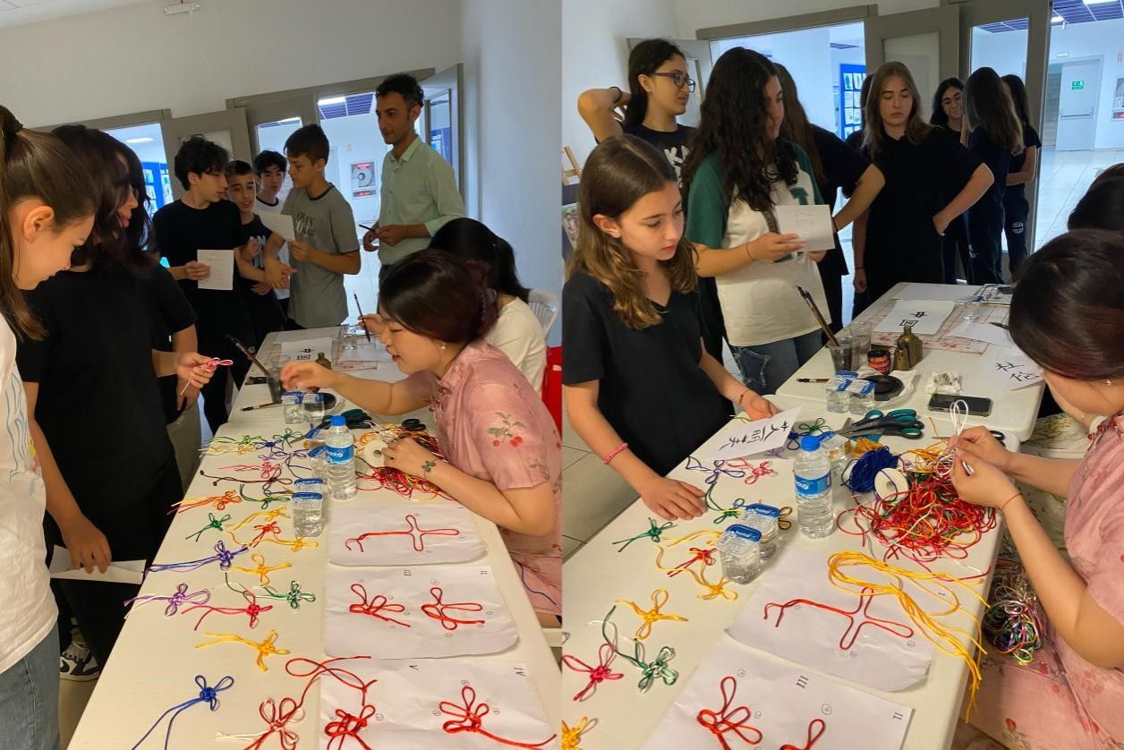 活动当天,奥坎私立学校的礼堂里装点着特色鲜明的中国元素饰品,校园走廊上也展出了孔子课堂学生绘制的中国主题作品。这些作品内容多样、色彩丰富,表达着学生们对中华文化的理解和对中国的热爱和向往。为了让奥坎私立学校的师生能够感受并了解中国语言文化,奥坎大学孔子学院的志愿者教师和学生助理在礼堂门口为大家开展了中国书法和中国结艺体验活动。秀丽俊逸的汉字书法和五彩精美的中国结让师生们充满好奇的同时,也迫不及待地尝试着握着毛笔比划、拿着彩绳编织,更是对自己的中文名字和得到的中国结爱不释手。