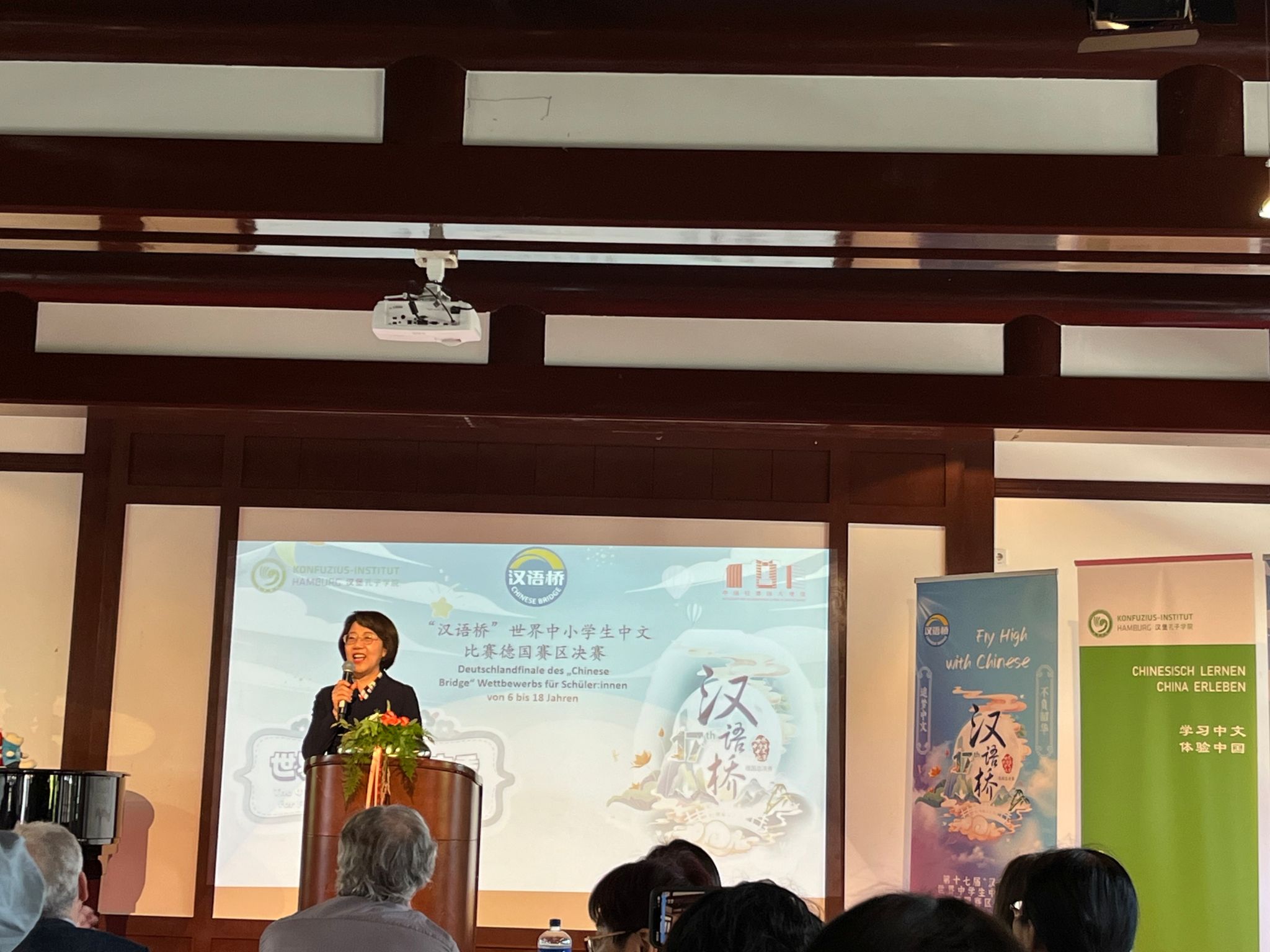 中国驻德国大使夫人郭金秋参赞、汉堡市办公厅主任科琳娜·尼恩施泰特 (Corinna Nienstedt)、不来梅孔子学院德方院长谢妮(Monika Schädler),德语区汉语教学协会第二会长刁岚博士分别为比赛致辞。致辞嘉宾分别称赞中小学生选手们学习汉语的勇气并鼓励他们即使落败也不要放弃学习中文的兴趣。