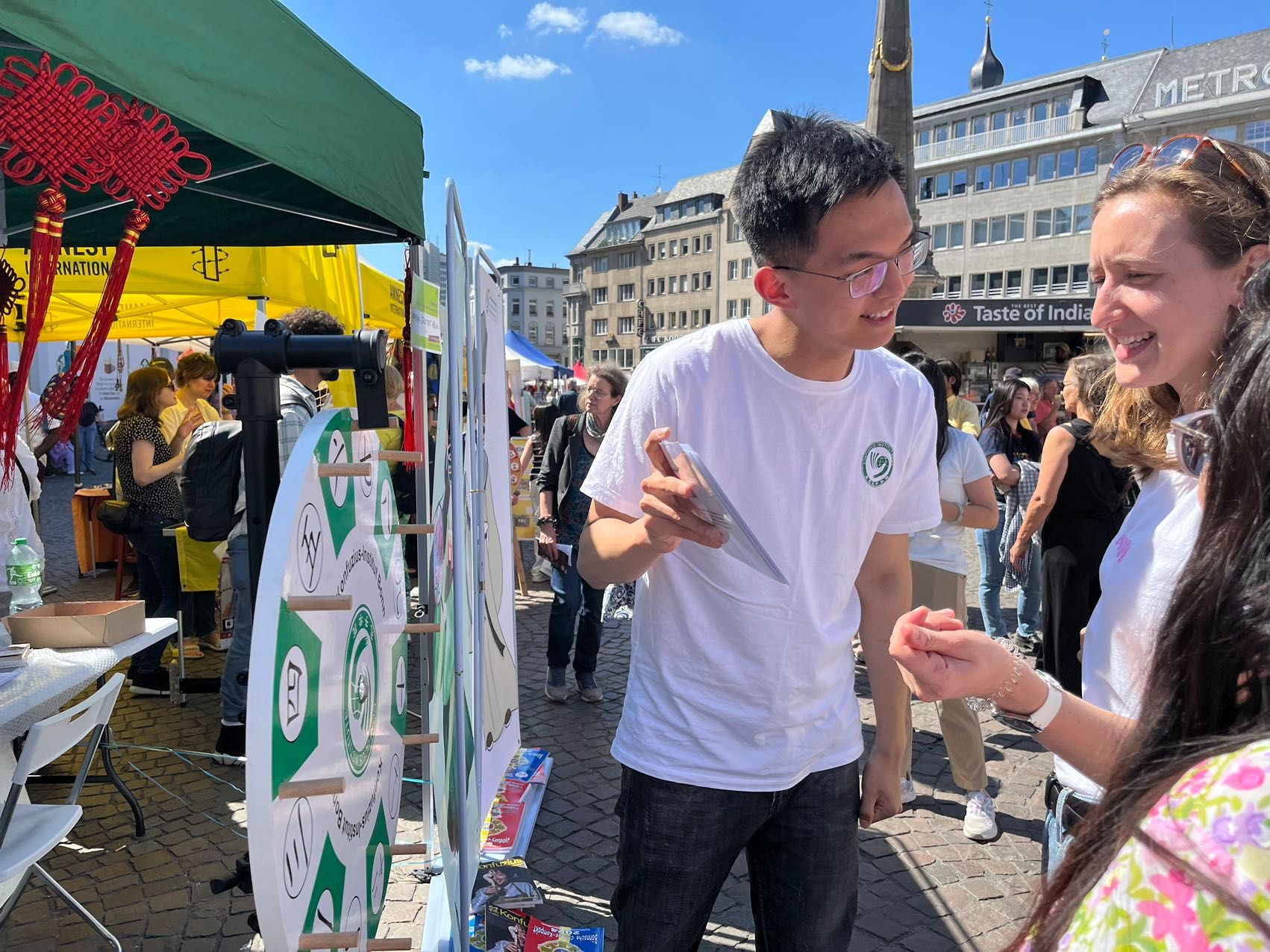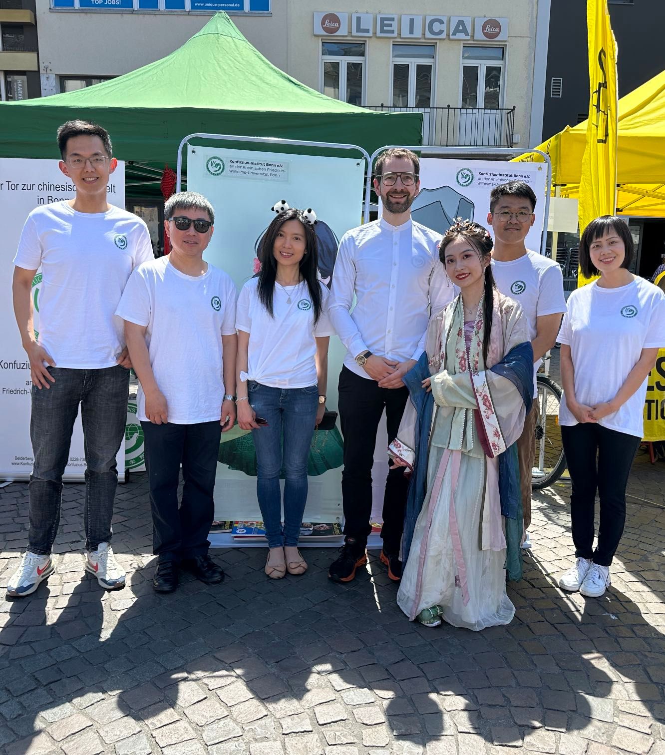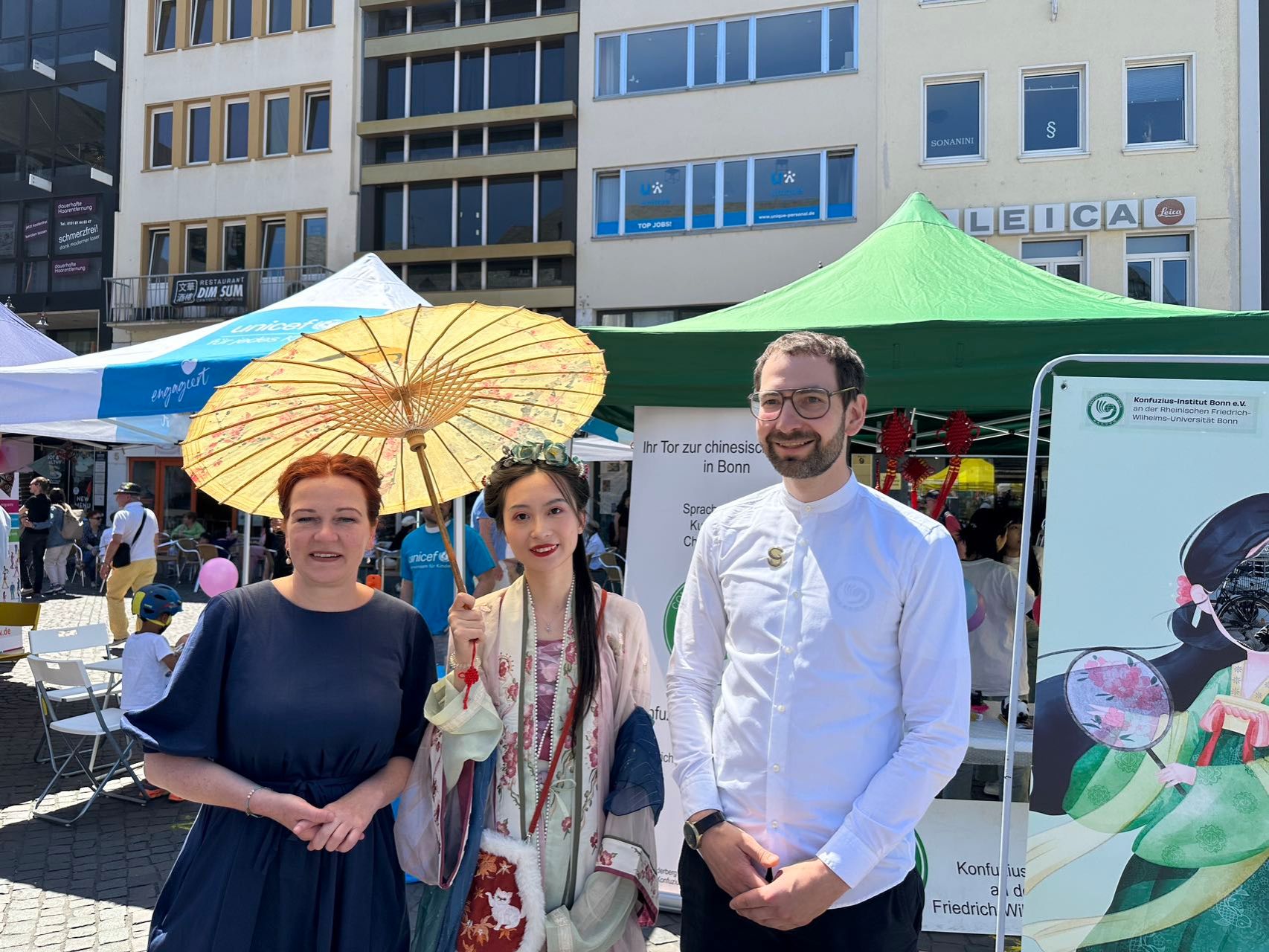 中午十二点,活动正式开始。路人们纷纷被波恩孔院的中国元素吸引。波恩市长卡特雅·多纳(Katja Dörner)女士同样来到了展位前参观。随后,波恩孔子学院德方执行院长叶翰识博士(Dr. Hannes Jedeck)与卡特雅·多纳女士合影,并赠送了中国特色礼物作为纪念。
