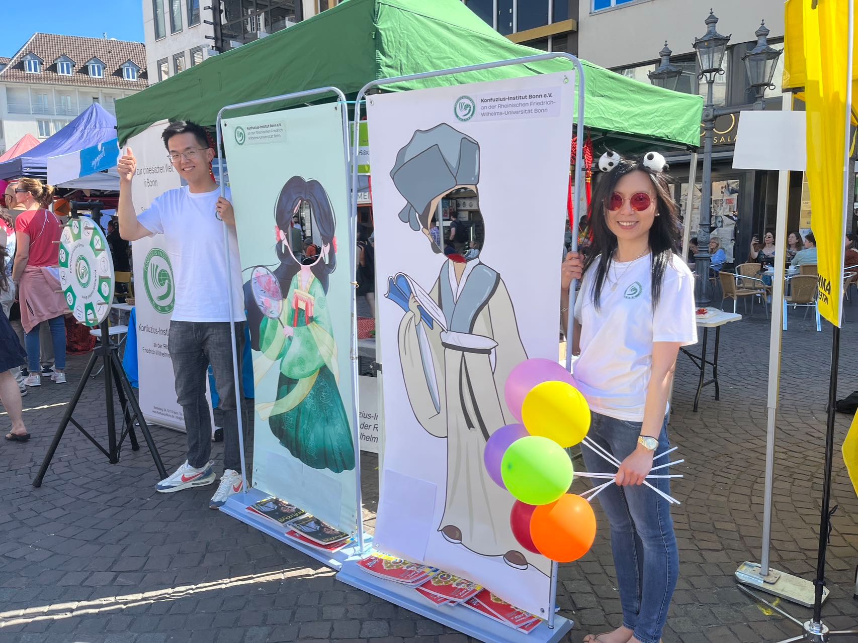 波恩孔子学院在主办方的盛情邀请下,同样在多元文化节上设置了其展示摊位。当天晴空万里,清风习习。在波恩孔院搭建的一片天地下,由中国结、小熊猫玩偶、中文书签以及合影立牌组成的中国元素吸引着来往路人的目光。