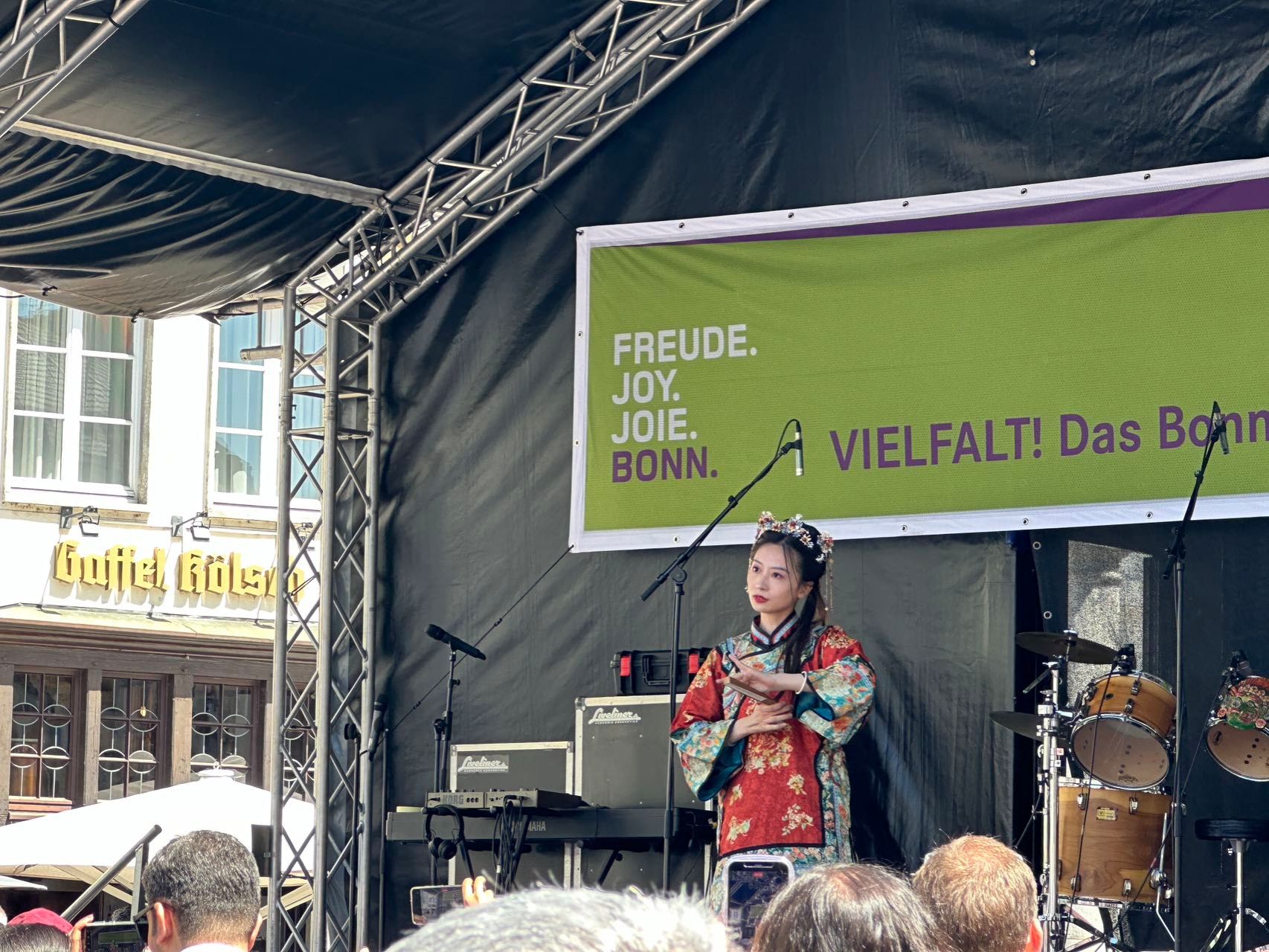 随后,来自不同国家地区的舞蹈家、合唱团队与音乐家们在波恩老市政厅前的舞台献上了具有地区特色与国家特色的表演。在波恩孔院的邀请下,青年舞蹈者曹谢域女士登台为波恩市民呈现了古代中国的特色舞蹈。而德方执行院长叶翰识博士也登台致辞,表达了波恩孔院推动中德文化发展,增进双方交流的愿望。