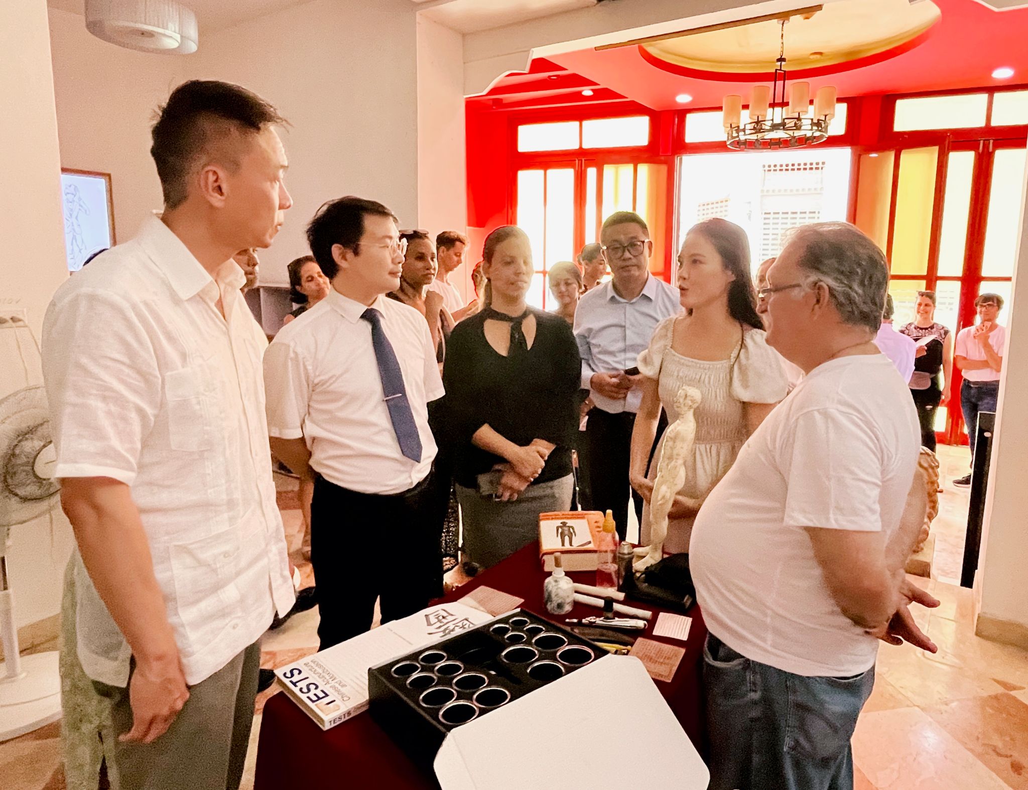 之后,大使参观了中医、书法、中国传统手工艺文化摊位。中医是哈大孔院的特色项目,中方院长丁汀、古方院长迪亚斯向大使介绍了中医课程的定位、课程特色及规模等。大使关切地询问中医在古巴的应用情况、普通古巴民众中间常见的疾患等,中医项目负责人Carlos老师一一详细回答,还展示了中医教学应用的各种器材。