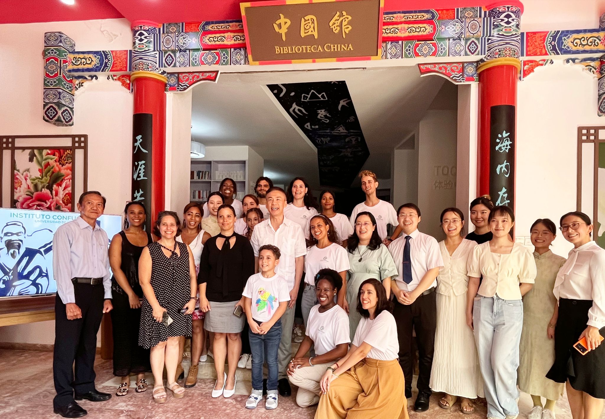 孔院合唱团师生共同表演了中国古风歌曲《敕勒歌》和流行歌曲《New Boy》,展现了积极昂扬、青春活泼的精神风貌,向大使一行表达了热烈欢迎。大使首先参观了孔院图书馆,了解藏书情况,关心作为古巴最大的中文图书馆,孔院如何为古巴师生、学者和民众提供支持和帮助。