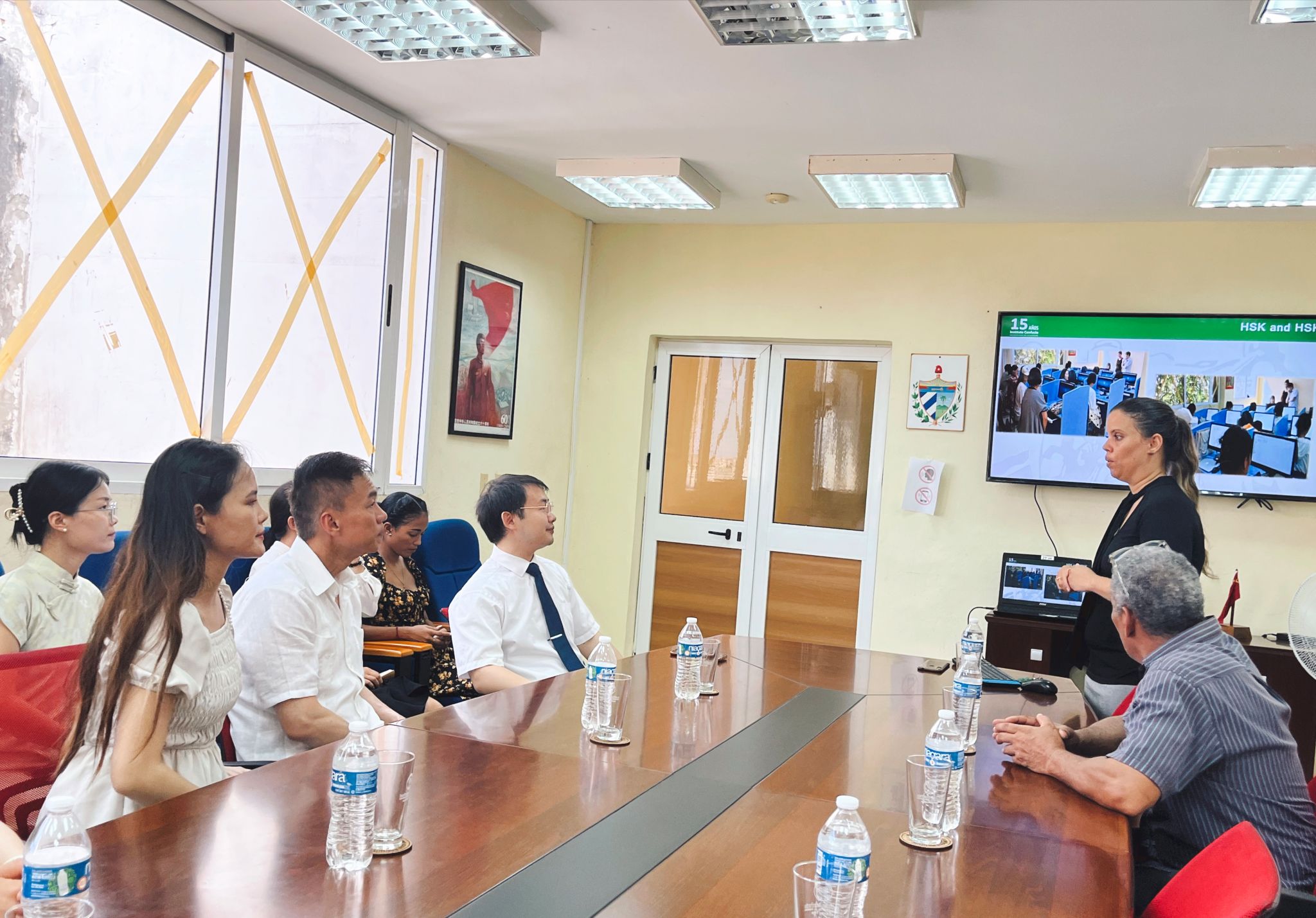 大使认真听取了汇报,就学生的培养、HSK考试通过率、中国教师任期、教师专业背景等细节进行深入了解,并表示,孔院十五年来一步一个脚印走来,已经取得了不少的成就。孔院作为一座桥梁,将中国人民同古巴人民友好地联系在一起。孔子学院不仅教授中文、传播中国文化,也通过这一平台,将古巴的文化传播给中国人。知识通过分享,传递给另一个人,双方都因此变得更富有。大使表示,中国驻古巴大使馆将会一如既往支持孔院的建设和发展。