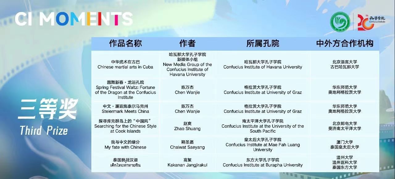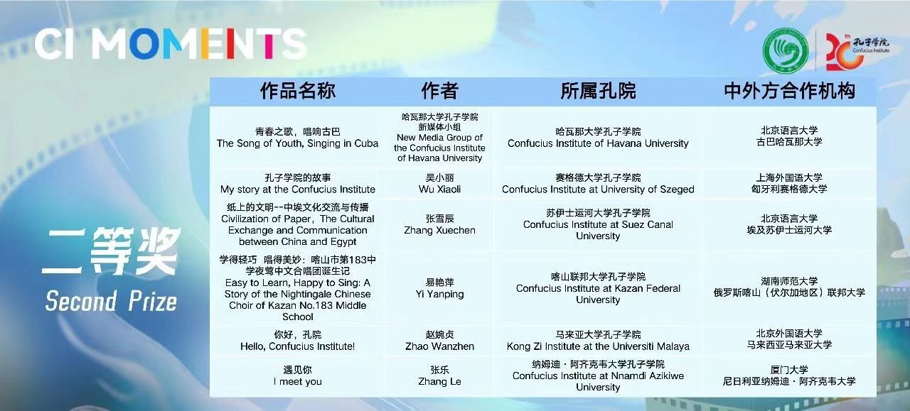 由郭芮希、冯雅婷、黄璨三位教师创作的《青春之歌,唱响古巴》荣获二等奖,由冯雅婷、刘嘉舫、李猛、郑绵绵四位教师创作的《中华武术在古巴》荣获三等奖;再次展现出哈大孔院教师团队对传播中华文化、讲述中文故事的才华与潜力。本次获奖不仅肯定了参赛师生的积极付出,更坚定了大家未来讲好中国故事、发扬孔院精神的信心和决心!