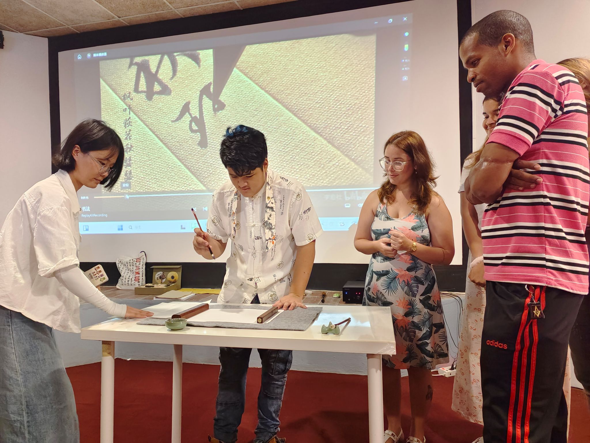 讲座的最后一个部分是书法体验活动。孔院优秀学员梁孝辉首先进行了现场示范,他精湛的技艺和流畅的笔法赢得了在场观众的阵阵掌声。跃跃欲试的三名观众举手登台,模仿指导老师的笔法,用毛笔在宣纸上书写,体验书法的笔法和结构,亲身体验书法的艺术魅力,感受书法的独特韵味。在自由体验环节,观众纷纷涌到台前,拿起毛笔,跟随着笔尖在纸上舞动,感受着墨迹在纸上的流动,体验着书法独有的韵律和力度。
