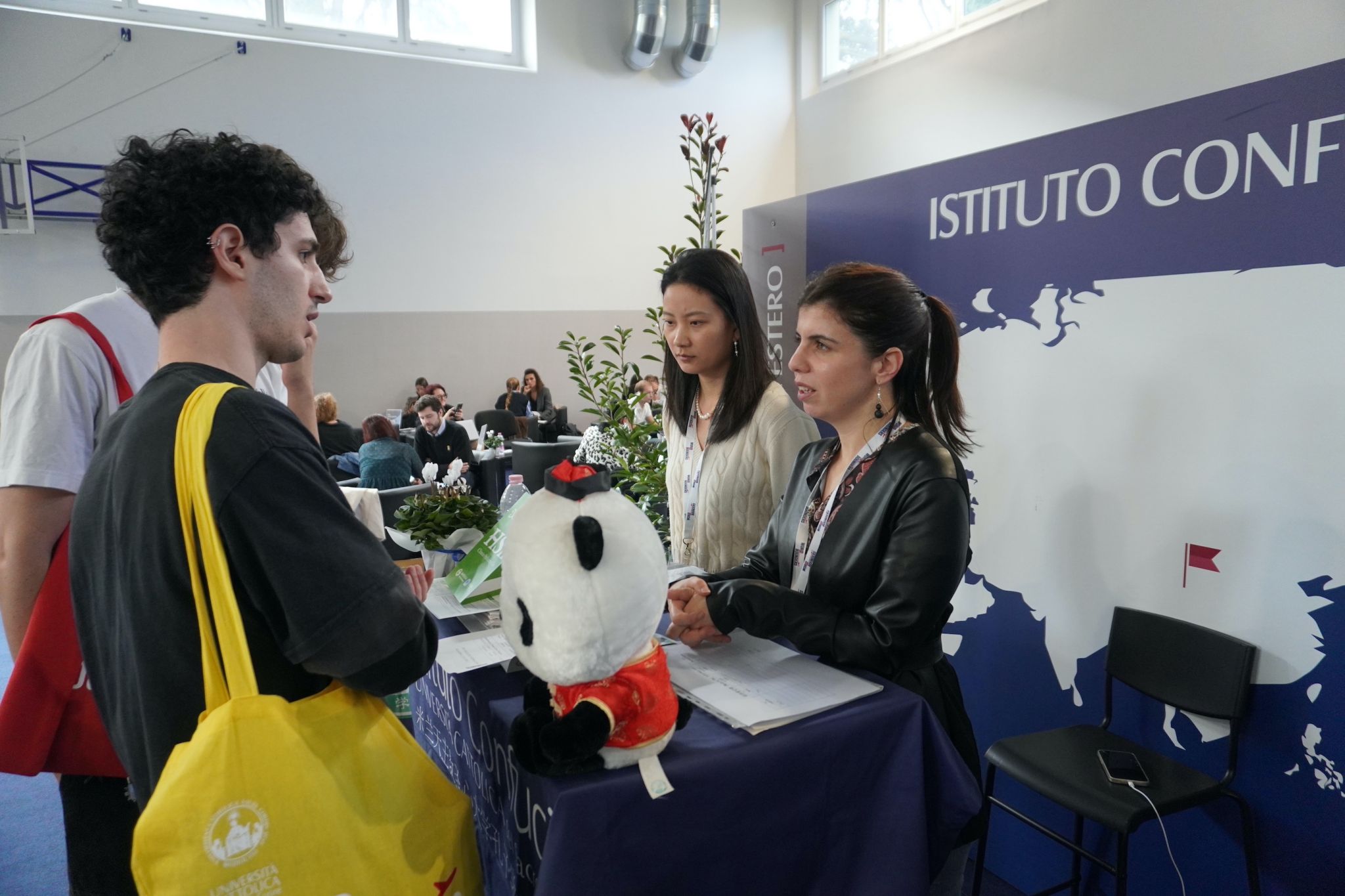 10月22日,布雷西亚校区国际周活动正式拉开帷幕。孔院项目经理安娜(Annachiara Maddaloni)、教师刘哲和志愿者教师郭子超参加了布雷西亚校区的国际周活动,为到场学生提供中文学习、夏令营和奖学金等项目的咨询服务。活动伊始,孔院展台便吸引了众多学生的关注,对中文课程和奖学金项目感兴趣的学生络绎不绝,孔院教师热情接待,并详细介绍了孔子学院的中文课程,奖学金申请条件等,受到学生们的积极回应。孔院教师表示,期待未来能在课堂上见到这些对中文和中国文化充满热情的学生。