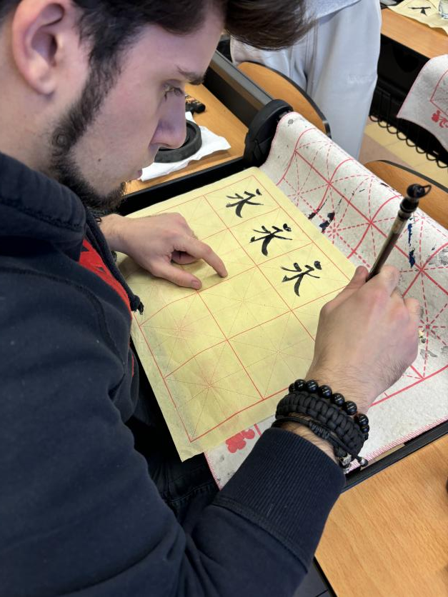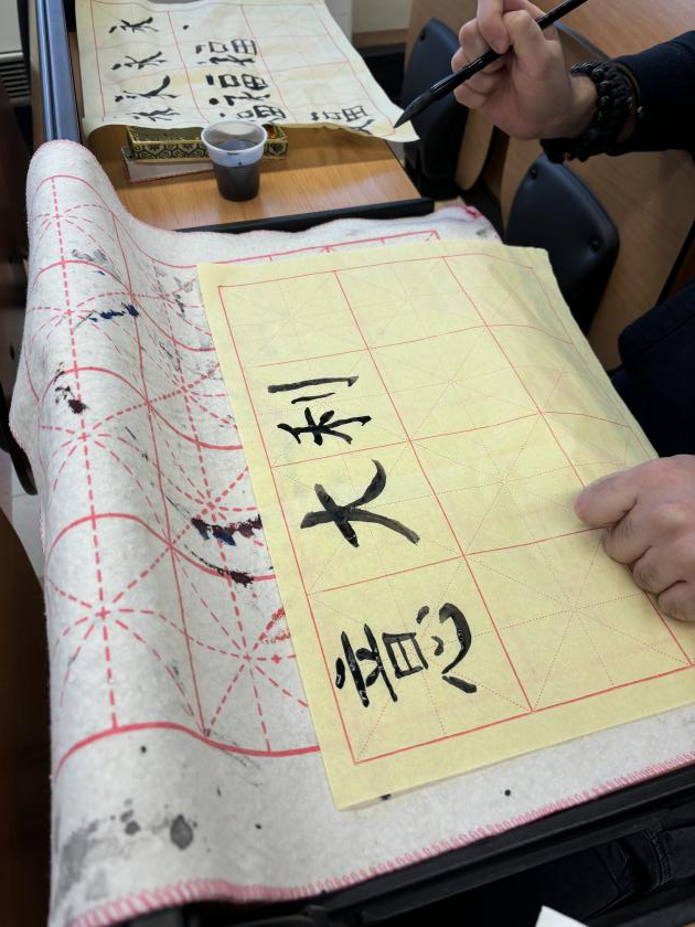 研好墨后,王迪老师为学生介绍了汉字的基本笔画和书法中的运笔技巧。随后,两位老师带领学生书写了“永”“福”“中国”和“意大利”等汉字。这些汉字包含了丰富的书法结构,尤其是“永”字中的八个基本笔画,展现了书法的精髓。