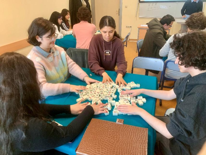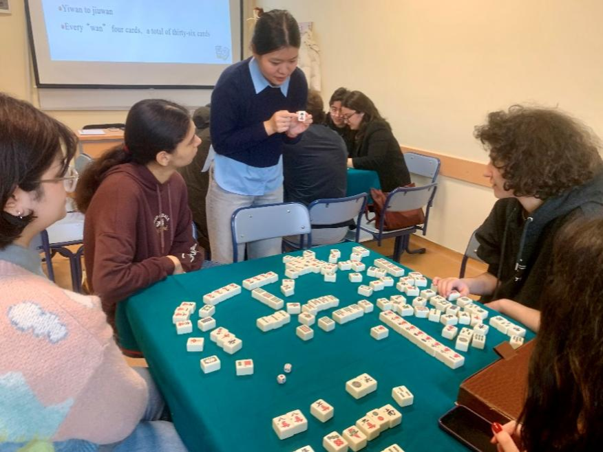 在实践环节,参与者以小组形式体验了一场别开生面的麻将游戏。在老师的指导下,大家边学边玩,逐渐掌握了游戏的节奏与策略。师生们聚精会神地排列手中的牌,不时为自己的“好牌”而欢呼。整个课堂气氛轻松愉悦,笑声不断。
