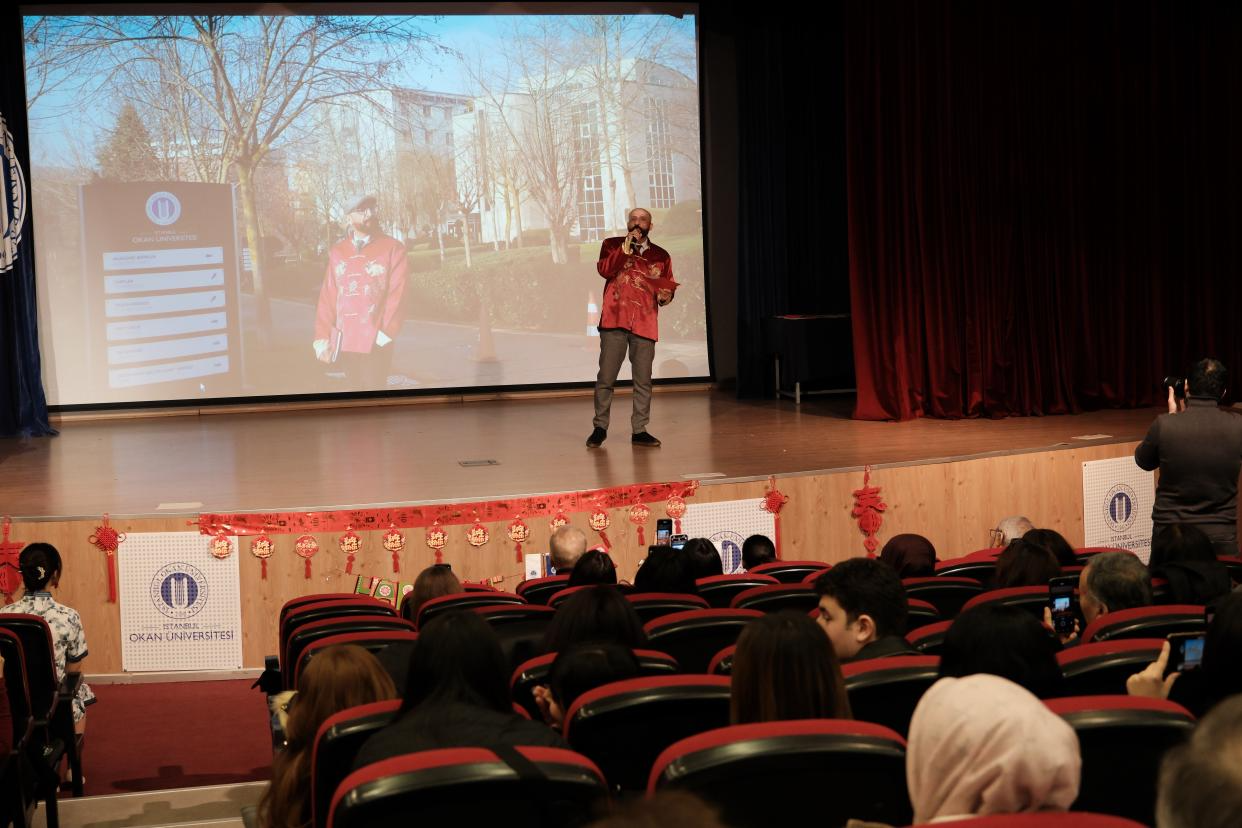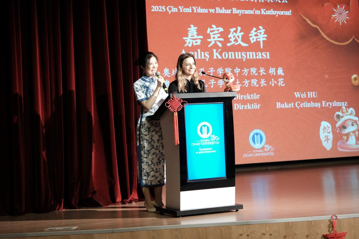 奥坎大学孔子学院中方院长胡巍老师和土方院长小花(Buket Çetinbaş Eryılmaz)老师首先致辞。她们表示,奥坎孔院一直致力于中土文化交流、文明互鉴,举办此次活动的目的旨在为中文学习和爱好者提供展示学习成果的舞台,并衷心祝福大家在灵动的蛇年万事顺利,巳巳如意。随后,伊斯坦布尔奥坎大学校长古丽孜·穆安(Prof. Dr. Güliz Muğan)教授为活动致辞,她首先强调了学习中文对中土文化交流的重要性,同时也感谢了所有为本次活动付出努力的老师和同学,最后祝愿所有的学生和老师在新的一年身体健康、事业顺利、学业有成。