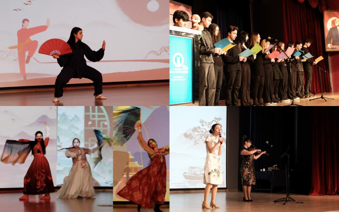 此次联欢活动中特设了中国传统文化展示类节目。其中,中文一年级海洋(Deniz Gümüşlü)同学带来的《酷炫空竹》展示了中国传统民间技艺“抖空竹”的灵动之美。二年级乡悦(Sıla Irmak)同学表演的太极扇《中国功夫》刚柔并济,表现了中华武术的神韵。二年级阿初(Elif Ünlü)、预备班尤尼丝(Mustafa Yunus Boğa)和兰云(Serra Nur Taşbağ)同学的书法与茶艺表演《茶韵墨华》更是给大家带来一场中华文化盛宴。