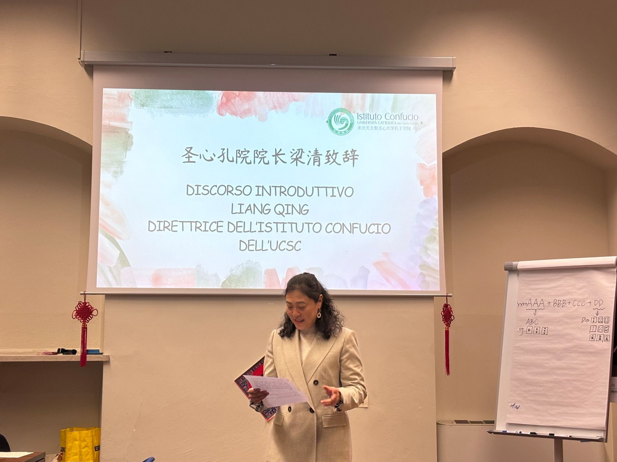 下午六点一刻,结业典礼准时开始。典礼伊始,孔院中方院长梁清教授用意大利语致辞,代表孔院向顺利完成学业的学员们表示祝贺,并高度肯定了大家在中文学习中的努力与进步。她鼓励学员们在未来继续坚持学习中文,深入了解中国文化,为中意两国的友好交流贡献自己的力量。