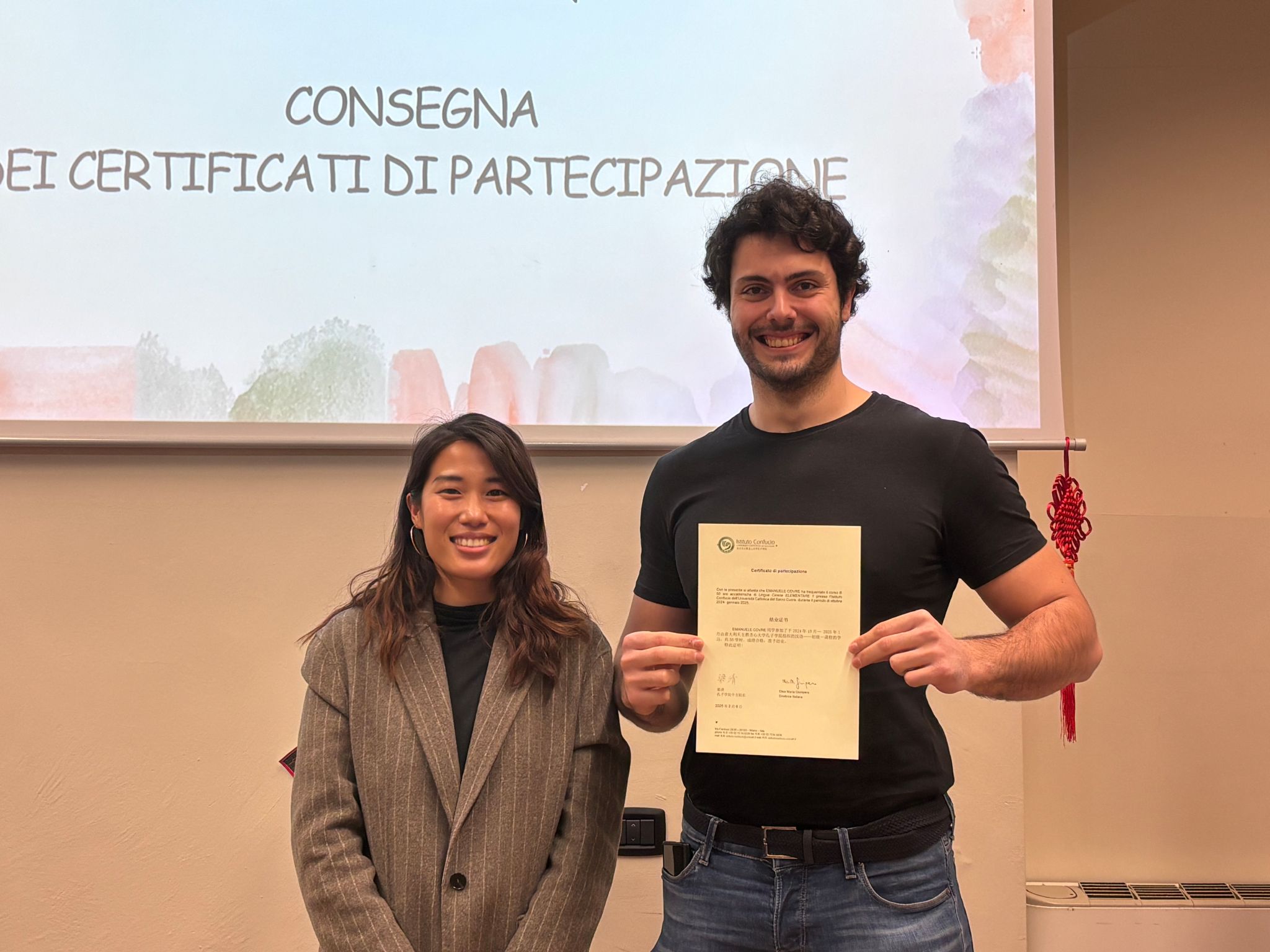 随后任课老师为各班合格学员颁发了结业证书,在这次典礼中,特别值得一提的是一位名叫潘安(Andrea)的学员。他是入门一班的学生,虽然住在米兰以外的地方,却始终坚持每周一和周三的晚上,坐火车来到米兰上课,以实际行动展现对汉语的执着与热爱。这份对知识的追求与对文化的热忱,正是语言学习者跨越地域界限、搭建文化桥梁的生动写照,也是孔院致力于推广汉语和中华文化的美好象征。