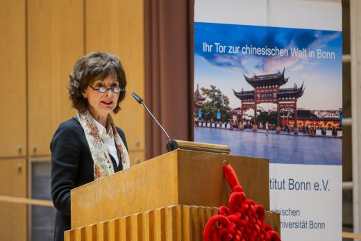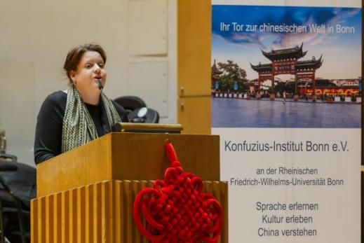 波恩孔子学院董事会成员、科隆东亚艺术博物馆前馆长施黛莉博士(Dr. Adele Schlombs)在致辞中分享了她多年来从事中德文化交流工作的心得,并向在场观众送上了诚挚的新春祝福。