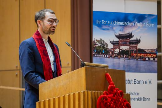 中国驻杜塞尔多夫总领事馆双边处主任寇天擎在致辞中高度评价了波恩孔子学院的工作。他表示,波恩孔子学院组织的中德文化和艺术交流活动加深了中德两国人民的相互了解,促进了双方在文化、教育等领域的相互学习。