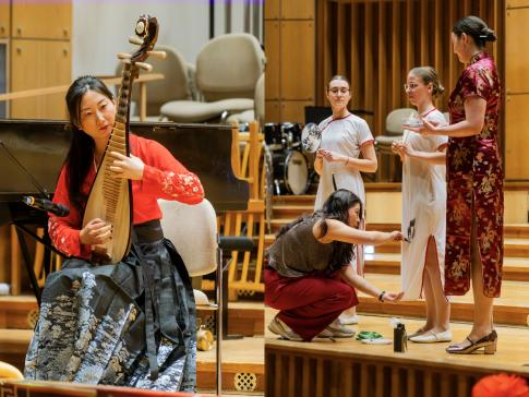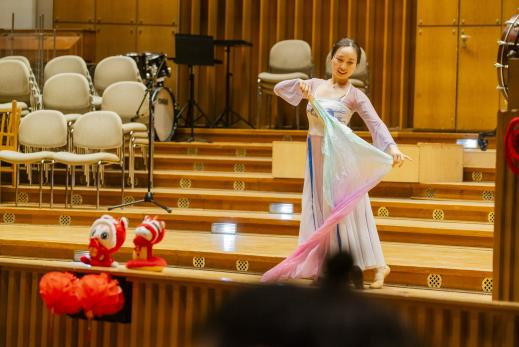 音乐会的节目精彩纷呈,充分展现了中国文化的多元与魅力:音乐会以波恩大学学生侯童童的开场舞蹈《吹梦到西洲》拉开序幕,曼妙的舞姿令全场掌声不断。来自波恩中文学校的三位学生带来了极具民族风情的傣族舞蹈《水之灵》,三位表演者以灵动的舞姿展现了傣族人民与水相依的文化。科隆少林文化中心的三位表演者带来的少林功夫表演更是震撼全场,表演者的凌空翻腾、刚劲拳法令全场观众感受到中华武术的磅礴气势。随后,张隽茜与马米乃合作带来了创意表演《弦声画锦》,在张隽茜悠扬的琵琶声中,马米乃在素白旗袍上现场作画,分别绘出莲花和竹子。琵琶的旋律与画笔的挥洒完美融合,这一独特的表演形式令观众赞叹不已。