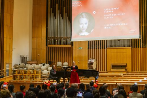 音乐会的下半场,女高音歌唱家安娜·赫布斯特(Anna Herbst)与钢琴家彼得·波特费尔德(Peter Bortfeldt)联袂登台,共同演绎了包括《玫瑰三愿》、《茉莉花》、《茉莉花丛》(Jasminenstrauch)在内的十五首中德经典曲目。安娜·赫布斯特的歌声动人,彼得·波特费尔德的钢琴演奏细腻,两人的默契合作将音乐会推向了高潮。