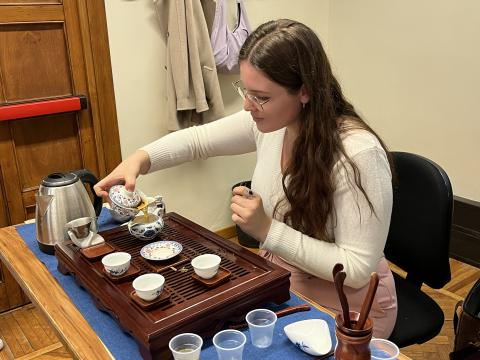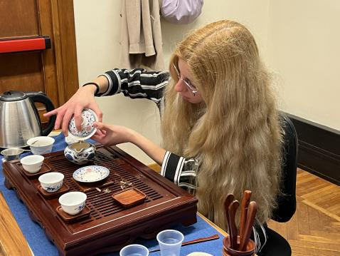 为了加深大家对茶艺的理解,匡佳菲老师随后又冲泡了大红袍(青茶)和龙井(绿茶),带领大家再次回顾泡茶的完整流程。在闻香、观色、品尝的过程中,学生们逐步感受到不同茶叶的独特风味,并纷纷表示对红茶尤为喜爱。在学生们的热情期待下,匡佳菲老师又给大家泡了经典红茶“正山小种”,品尝后,学生纷纷赞叹道“这是最好喝的!”。