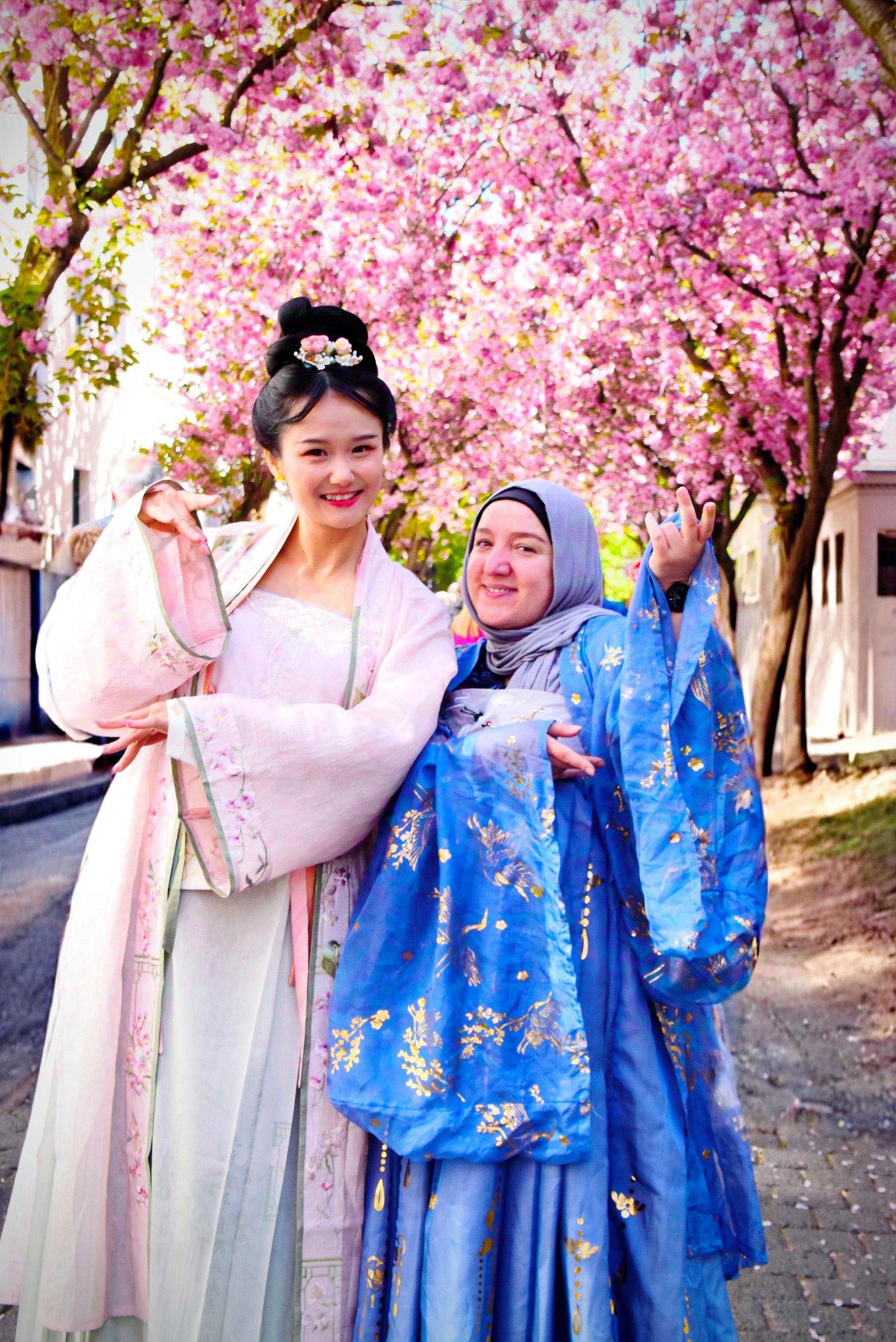 此次活动共有两部分组成,第一部分是汉服试穿活动,游人在缀满浅粉色的樱花树下穿上来自中国的古典汉服,体会中国服饰之美。因此在落英缤纷的春日暖阳中,你能看到来自不同国家的人们穿着汉服打卡拍照,排起长队,还有不少希望未来能够购买一套传统汉服,感叹其精致的工艺。