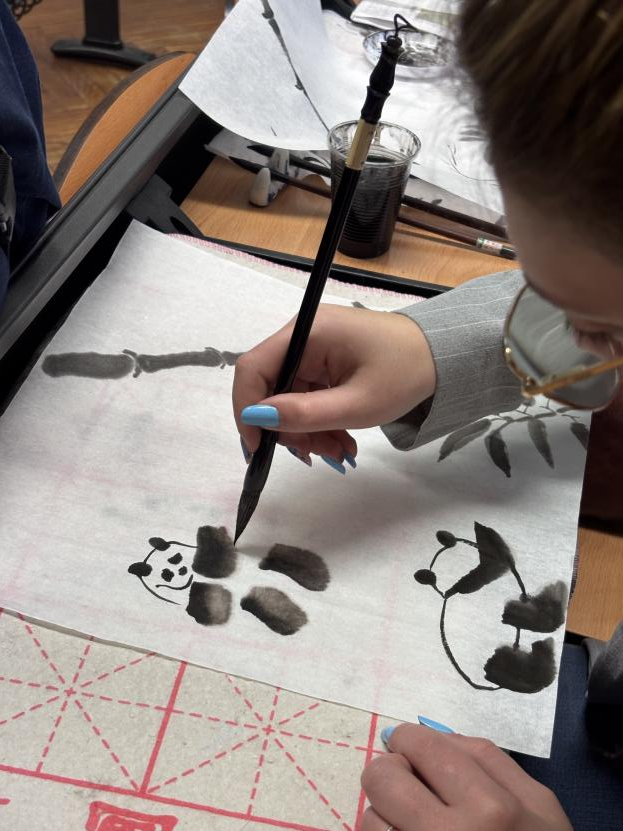 在完成基本笔触练习后,黎佳欣老师带大家进入今天的主题创作:熊猫与竹子。她首先展示了中国画中以熊猫为主题的作品,引导学生们细致观察其形体结构,讲解国画中粗细毛笔的交替运用,并循序渐进地演示如何分步骤绘制出熊猫身体的各个部分。